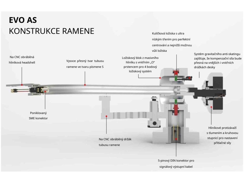 Ramię gramofonowe EVO AS składa się ze specjalnej aluminiowej rurki z wewnętrznym tłumieniem w kształcie litery S z zakończeniem SME. Ramię w kształcie litery S to nie tylko element konstrukcyjny każdego gramofonu, ale także kilka zalet technicznych. Korzysta przede wszystkim z mniejszych zniekształceń kąta rowka i doskonałej zdolności śledzenia.