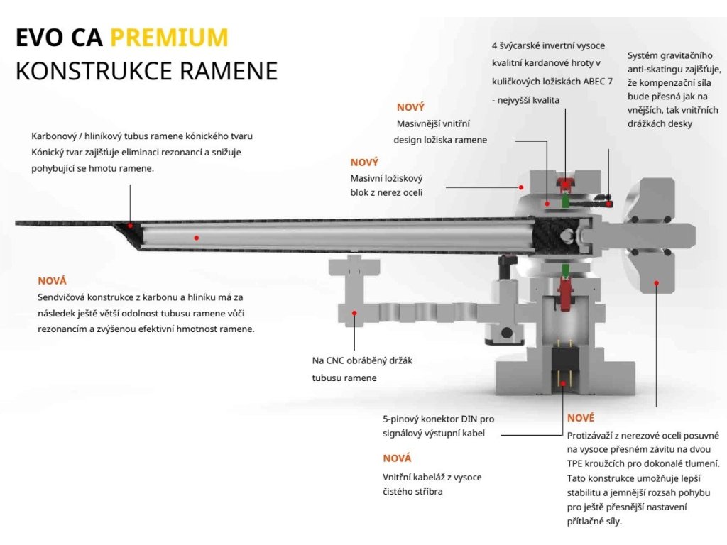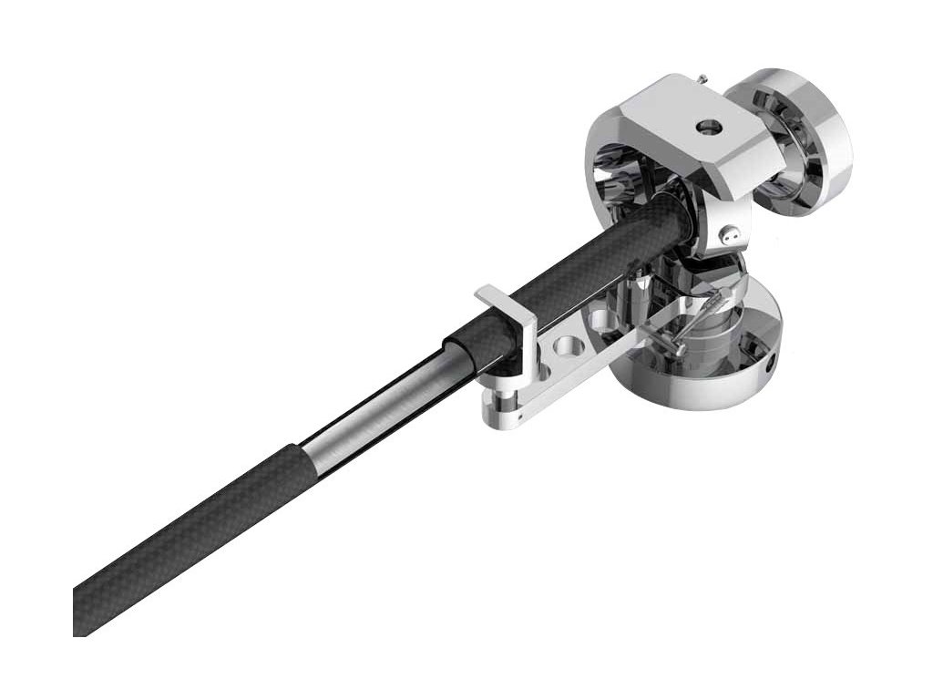 Prosta tuba ramienia EVO 12 CA PREMIUM HG to hybrydowe rozwiązanie o stożkowym kształcie, które ogranicza powstawanie rezonansów i zmniejsza poruszającą się masę ramienia. Specjalną konstrukcję warstwową tworzy zewnętrzna rurka wykonana z włókna węglowego, które jest lekkie i jednocześnie mocne, oraz wewnętrzna ukryta rurka aluminiowa, która pomaga tłumić wibracje. To specyficzne rozwiązanie zapobiega odbiciom fal stojących, poprawia odporność tubusu na rezonanse, a jednocześnie zwiększa efektywną masę ramienia. Sygnał jest prowadzony przewodnikami z wysokiej czystości srebra. System grawitacyjnego anti-skatingu zapewnia dokładną siłę kompensacyjną zarówno na wewnętrznych, jak i na zewnętrznych rowkach płyty gramofonowej. Przeciwwaga ze stali nierdzewnej jest przesuwna na bardzo precyzyjnym gwincie na dwóch pierścieniach TPE i gwarantuje doskonałe tłumienie. Taka konstrukcja umożliwia lepszą stabilność i delikatniejszy zakres ruchu dla jeszcze dokładniejszego ustawienia siły nacisku.