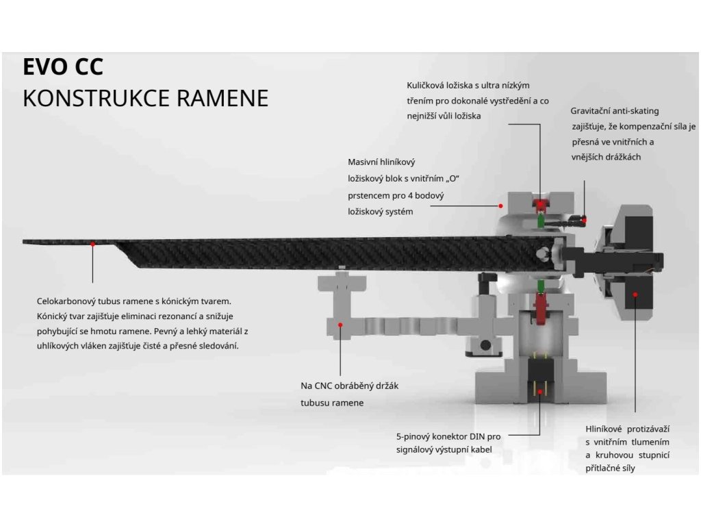 Prosty tubus ramienia EVO 12 CC HG z włókna węglowego ma stożkowy kształt, który ogranicza rezonanse i zmniejsza poruszającą się masę ramienia. Włókno węglowe jest bardzo lekkie i jednocześnie mocne, a dzięki wymagającemu procesowi produkcyjnemu jest doskonałym materiałem na ramiona gramofonowe. Sygnał jest prowadzony przez przewody z miedzi o wysokiej czystości. System grawitacyjnego anti-skatingu zapewnia dokładną siłę kompensacyjną zarówno na wewnętrznych, jak i na zewnętrznych rowkach płyty gramofonowej. Przeciwwaga z aluminium ma wewnętrzne tłumienie TPE i okrągłą skalę do precyzyjnej regulacji siły nacisku.