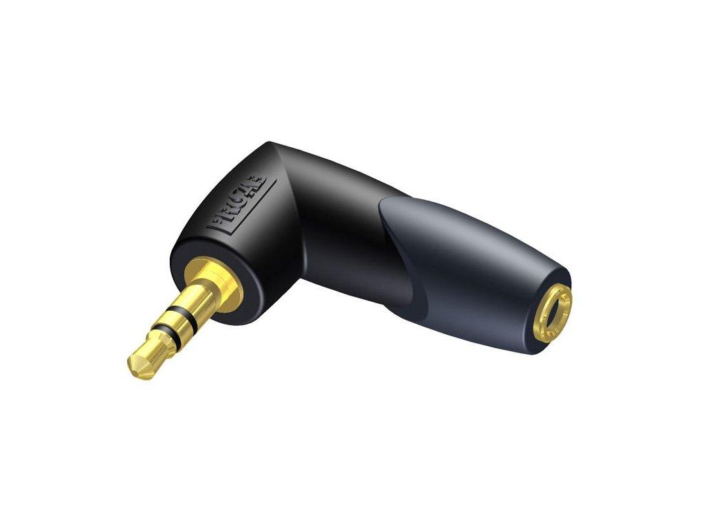 Profesjonalna redukcja-adapter z Jack 3,5mm Stereo prosty żeński na Jack 3,5mm Stereo kątowy męski, pozłacane kontakty, wytrzymała plastikowa obudowa.
