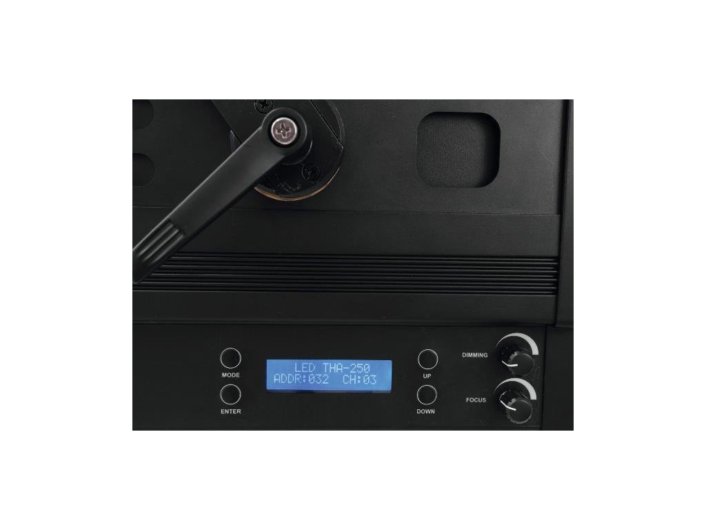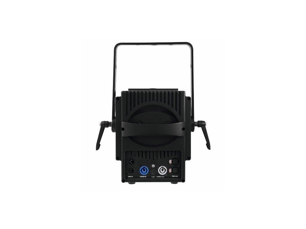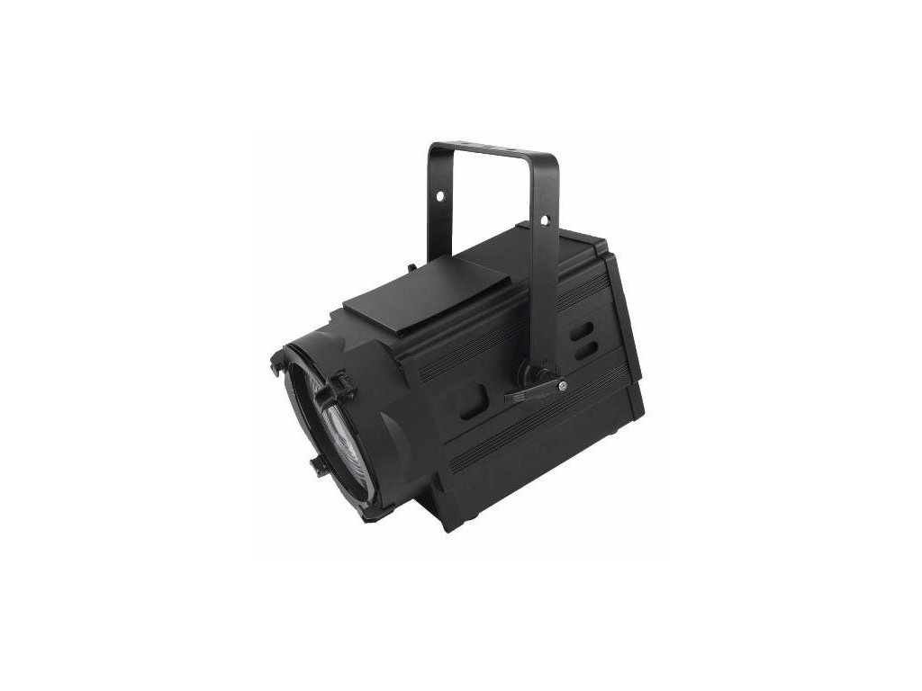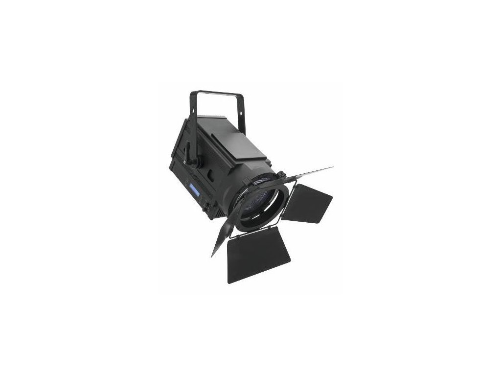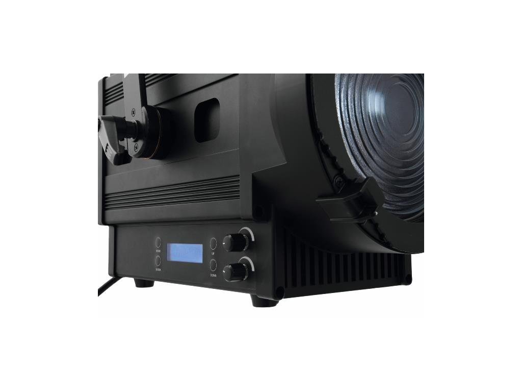 Profesjonalny teatralny reflektor LED wyposażony w białą diodę COB LED o mocy 200W. Soczewka Fresnela, temperatura barw ciepła biała (2800K), CRI >90, ciągłe świecenie bez migotania projekcji. Funkcja ściemniania (można ustawić różne krzywe ściemniania), efekt Strobo oraz zmotoryzowany i manualny Zoom (ostrość). Sterowanie DMX (3 kanały sterujące) lub za pomocą panelu sterowania z wyświetlaczem LED na reflektorze. Dostarczane wraz z regulowanym uchwytem montażowym, wbudowany uchwyt ułatwiający przenoszenie, gumowe nóżki umożliwiające ustawienie na twardym podłożu. Aktywne chłodzenie wentylatorem, obsługa RDM (Remote Device Management). Podłączenie zasilania za pomocą złącza Neutrik PowerCon i dołączonego kabla zasilającego z wtyczką bezpieczeństwa. Przełączany zasilacz impulsowy do pracy w zakresie od 100 do 240 V. Możliwość szeregowego zasilania do 8 reflektorów.