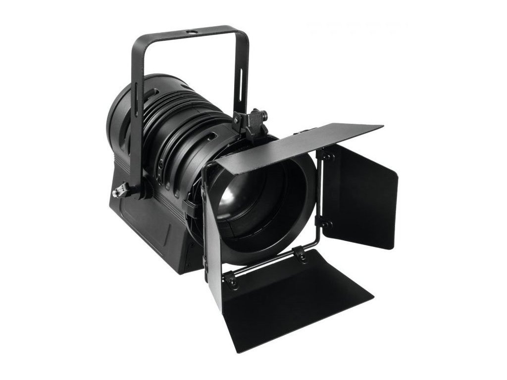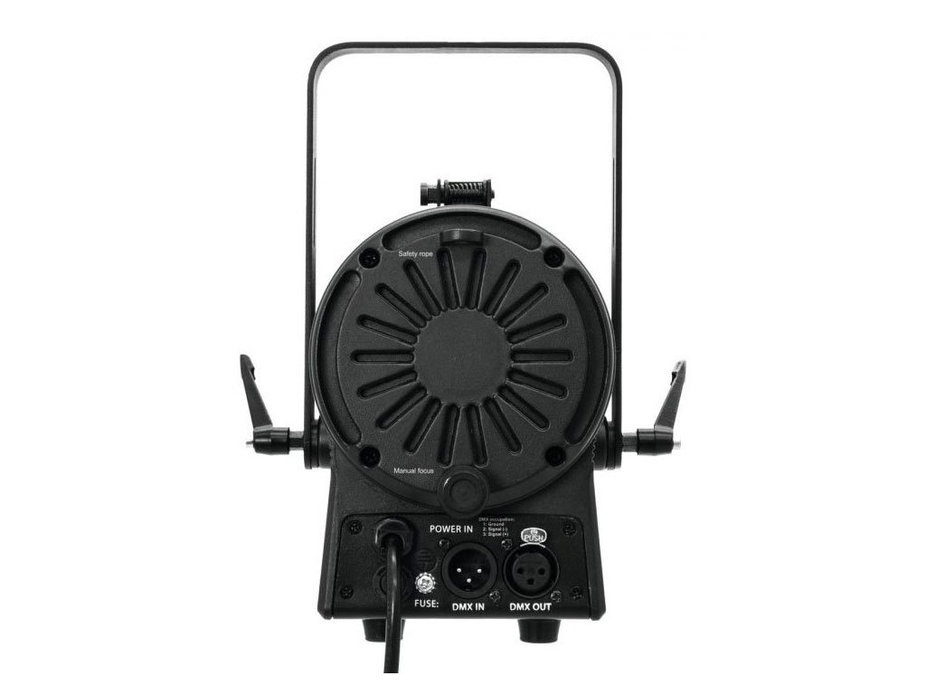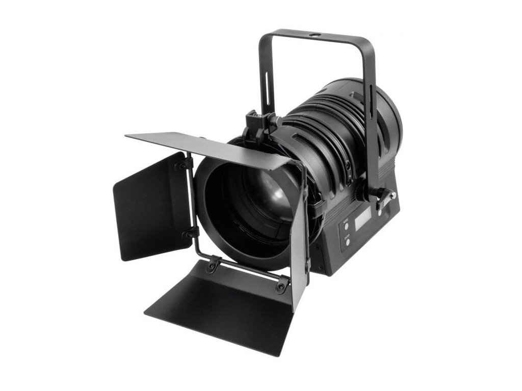 Kompaktowy teatralny reflektor LED w kolorze czarnym. Efekt świetlny jest wyposażony w diodę 60W COB LED (czerwona, zielona, niebieska i biała). Mieszanie kolorów RGBW, przenikanie kolorów, wbudowane programy automatyczne, ręczna regulacja ogniskowej, efekt Strobo i funkcja ściemniania z ustawieniem krzywej i prędkości (skokowej reakcji) funkcji. Wysokiej jakości optyka z soczewką Plano Convex. Sterowanie za pomocą sygnału DMX (2/5/6/7 kanałów sterujących), samodzielny tryb pracy Stand-alone z funkcją Master/Slave. Wbudowany panel sterowania z wyświetlaczem LCD do ustawiania trybów pracy i adresowania DMX. Obsługa RDM, metalowa obudowa z uchwytem montażowym, gumowe nóżki do umieszczenia na twardym podłożu, aktywne chłodzenie wentylatorem. W zestawie znajdują się klapy kierunkowe i ramka na filtry kolorowe.