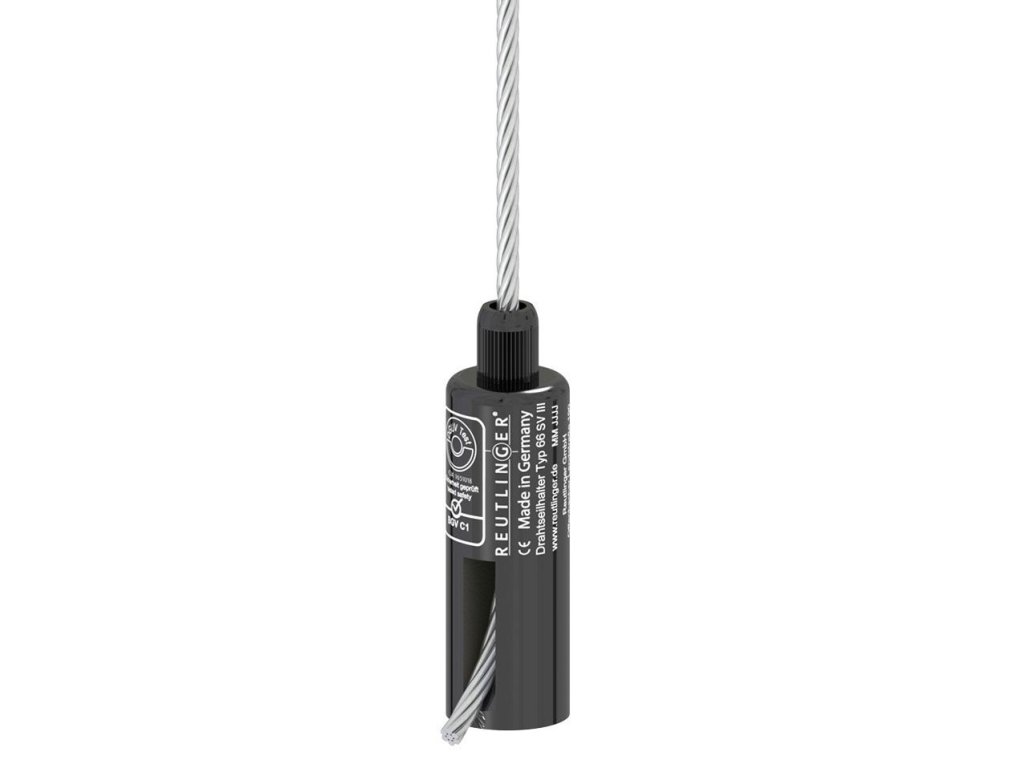 Uchwyt liny z bocznym wyjściem kablowym, gwintem wewnętrznym M16, nakrętką zabezpieczającą i mechanizmem chwytającym z sześcioma kulkami, który posiada certyfikat TÜV, a także certyfikat badania do użytku w ramach rozporządzenia DGUV 17 (BGV C1).