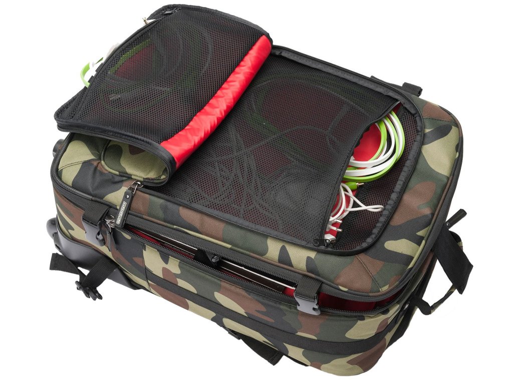 - Duża przednia komora z siatkowymi organizerami na kable i drobne akcesoria + oddzielna kieszeń szybkiego dostępu na dokumenty podróżne