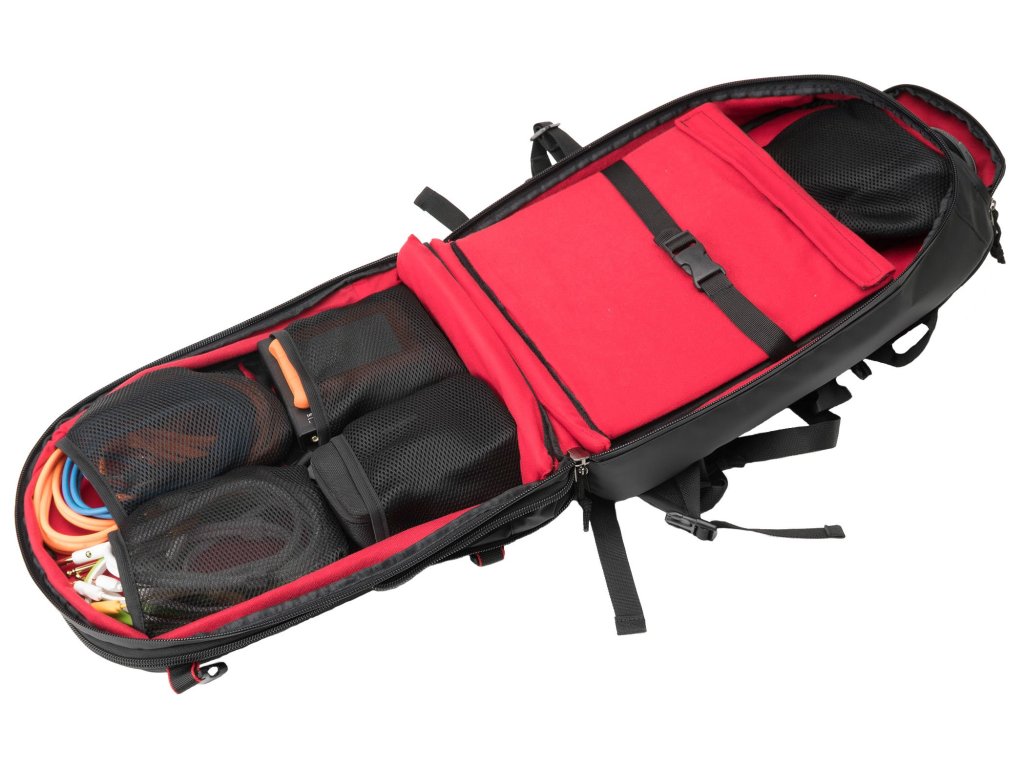 - Jedna wewnętrzna, wisząca kieszeń z siatki na akcesoria wygodnie wypełnia górną część plecaka