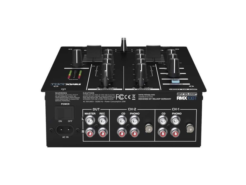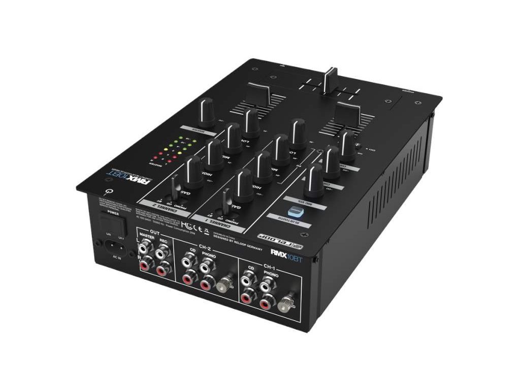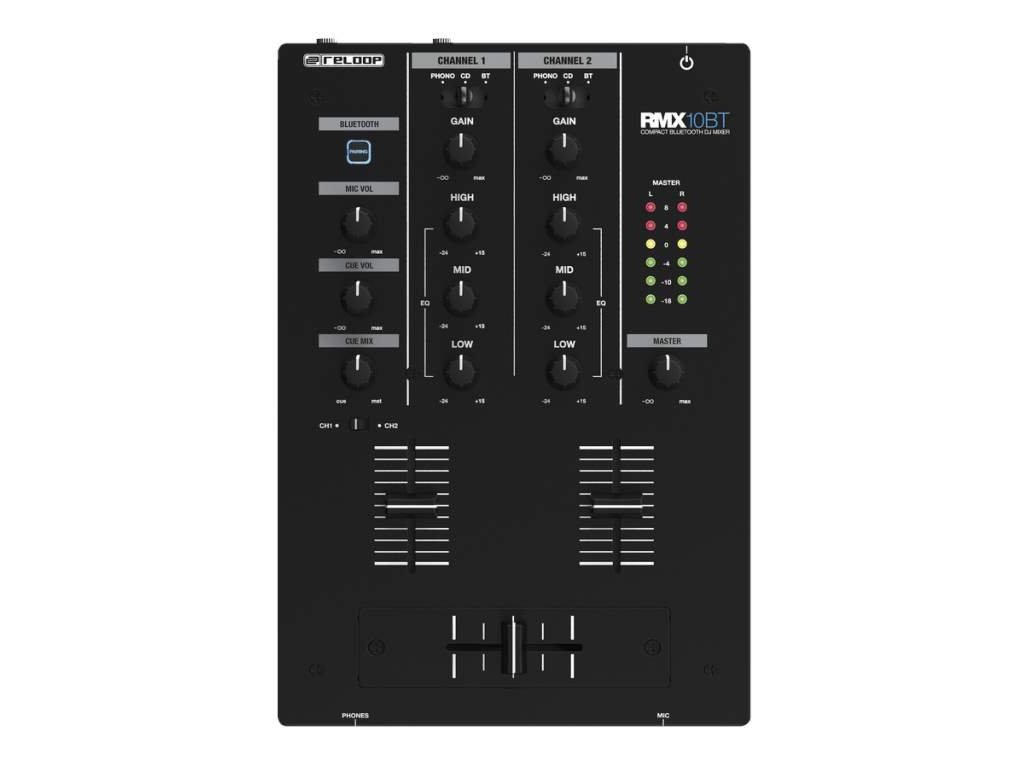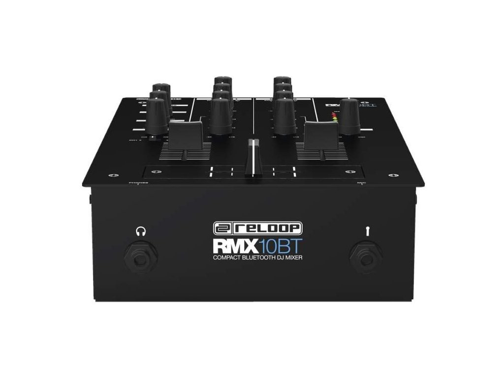Reloop RMX-10BT składa się z panelu sterowania, na którym znajdują się trzy 45-milimetrowe fadery, z których dwa służą do miksowania sygnału wejściowego, a jeden pełni funkcję crossfadera. Sygnał można dodatkowo regulować za pomocą trzypasmowego korektora i pokrętła Volume. Informacje o głośności przekazuje sześciopoziomowy wskaźnik LED. Przedni panel oferuje wyjście słuchawkowe i wejście mikrofonowe, odpowiednie np. do mówionego słowa i karaoke.