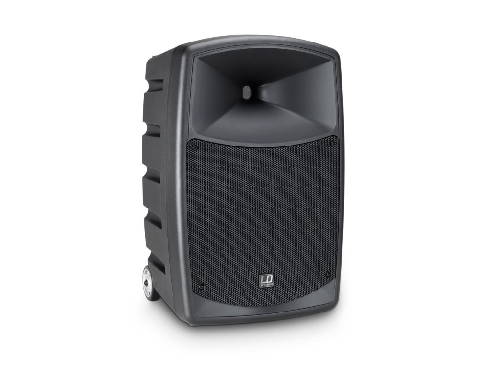 Dzięki wbudowanym kółkom i teleskopowemu uchwytowi zestaw głośnikowy można łatwo transportować, a na górnym panelu jest również miejsce na dwa mikrofony bezprzewodowe.