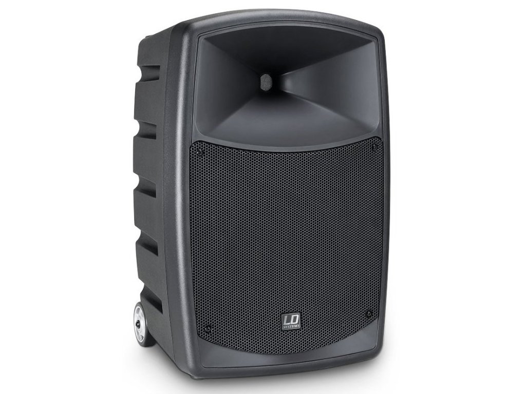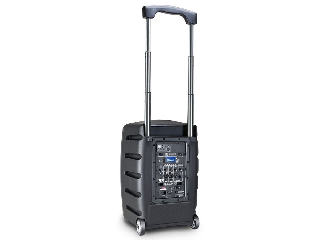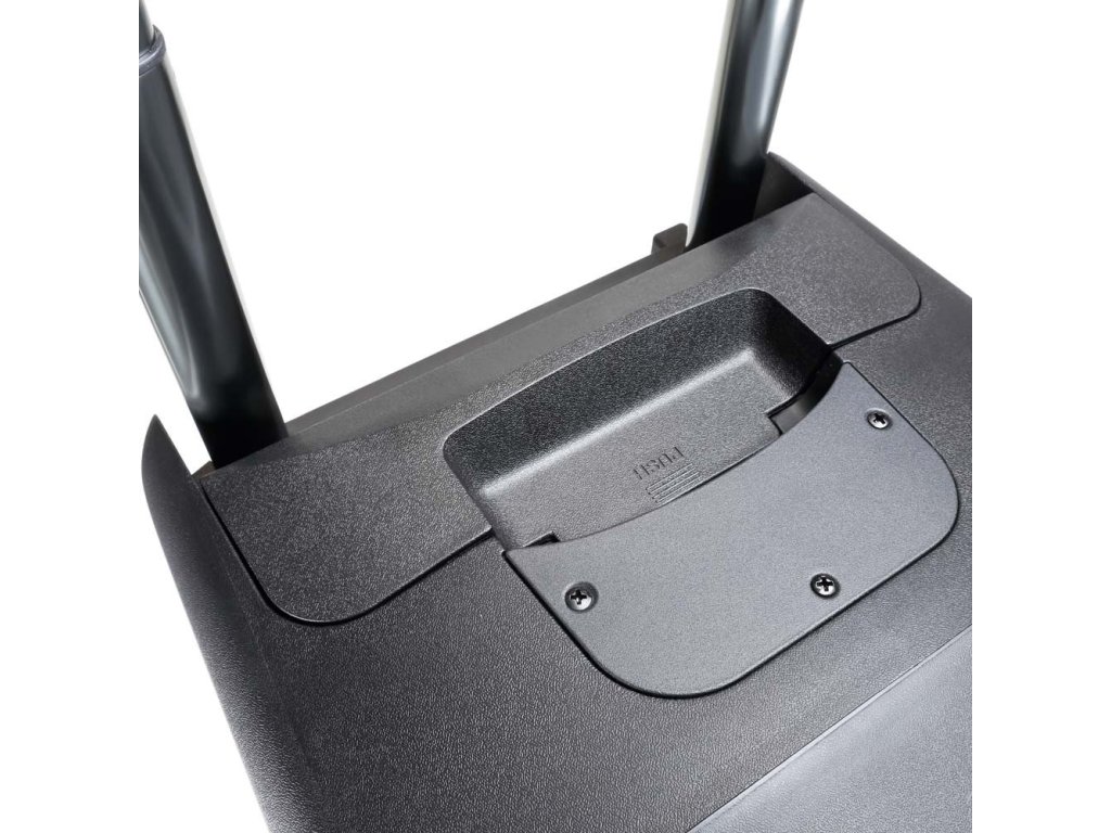 Dzięki wbudowanym kółkom i teleskopowemu uchwytowi zestaw głośnikowy można łatwo transportować, a na górnym panelu jest również miejsce na dwa mikrofony bezprzewodowe.