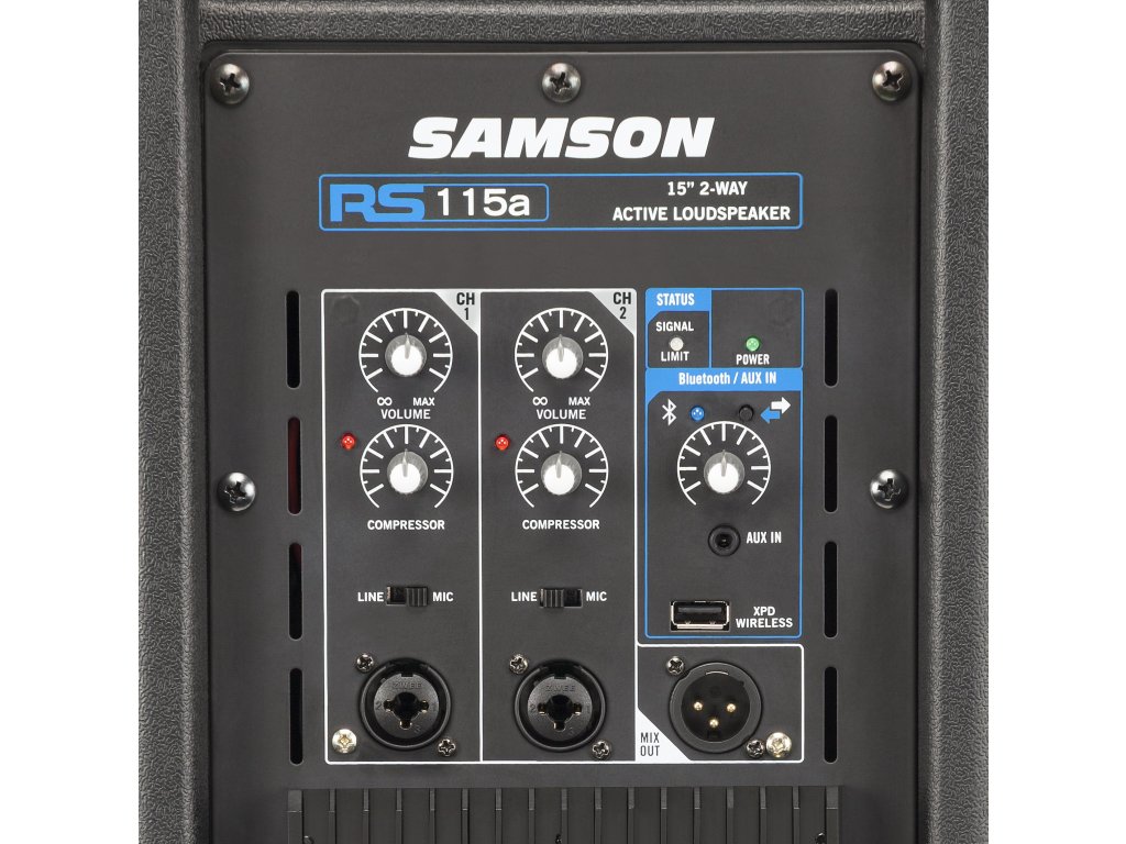 Przedwzmacniacz głośnika Samson RS-115A oferuje trzy kanały z oddzielnymi regulatorami głośności. Pierwsze dwa kanały są wyposażone w kombinowane złącze Jack/XLR, dzięki czemu można bez problemu podłączyć całą gamę sygnałów od mikrofonu po klawisze lub odtwarzacz CD. Wszechstronność wejść zwiększa przycisk przełączania czułości mic/line. Ciekawą funkcją jest obecność kompresora z oddzielnym regulatorem dla każdego kanału. Dzięki kombinowanemu złączu i przełącznikowi czułości można precyzyjnie ustawioną czułość wejścia jeszcze wspomóc funkcją kompresora i ograniczyć w ten sposób ewentualne niepożądane przesterowanie wejścia przy dynamicznych szczytach. Do wejścia można w ten sposób doprowadzić sygnał o wyższej intensywności i mieć większą przestrzeń podczas pracy ze wzmacniaczem końcowym. Trzeci kanał jest wyposażony w złącze Jack 3.5mm i regulator głośności, którym można sterować również siłą sygnału z podłączonego urządzenia Bluetooth.