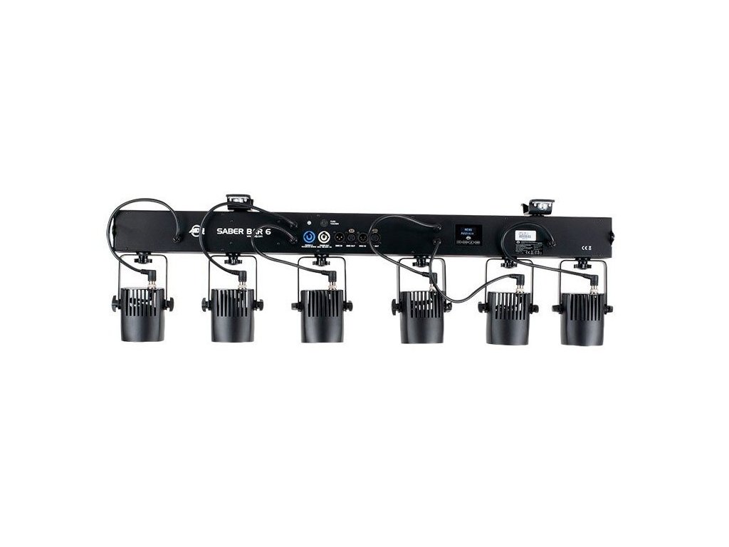 Tylny panel jest wyposażony w wyświetlacz z funkcjonalnymi przyciskami, 3-pinowe i 5-pinowe wejściowe i wyjściowe złącze DMX In / Out do podłączenia danych. Dostępnych jest kilka trybów kanałów DMX, wbudowane programy i 6 trybów ściemniania. Sabre Bar 6 jest idealny do instalacji i oświetlenia w sklepach detalicznych.