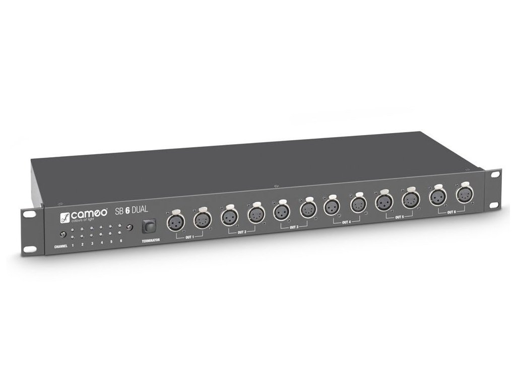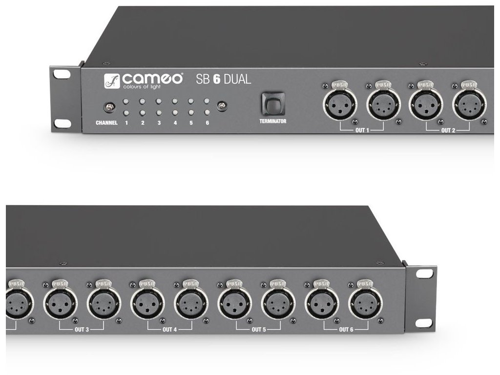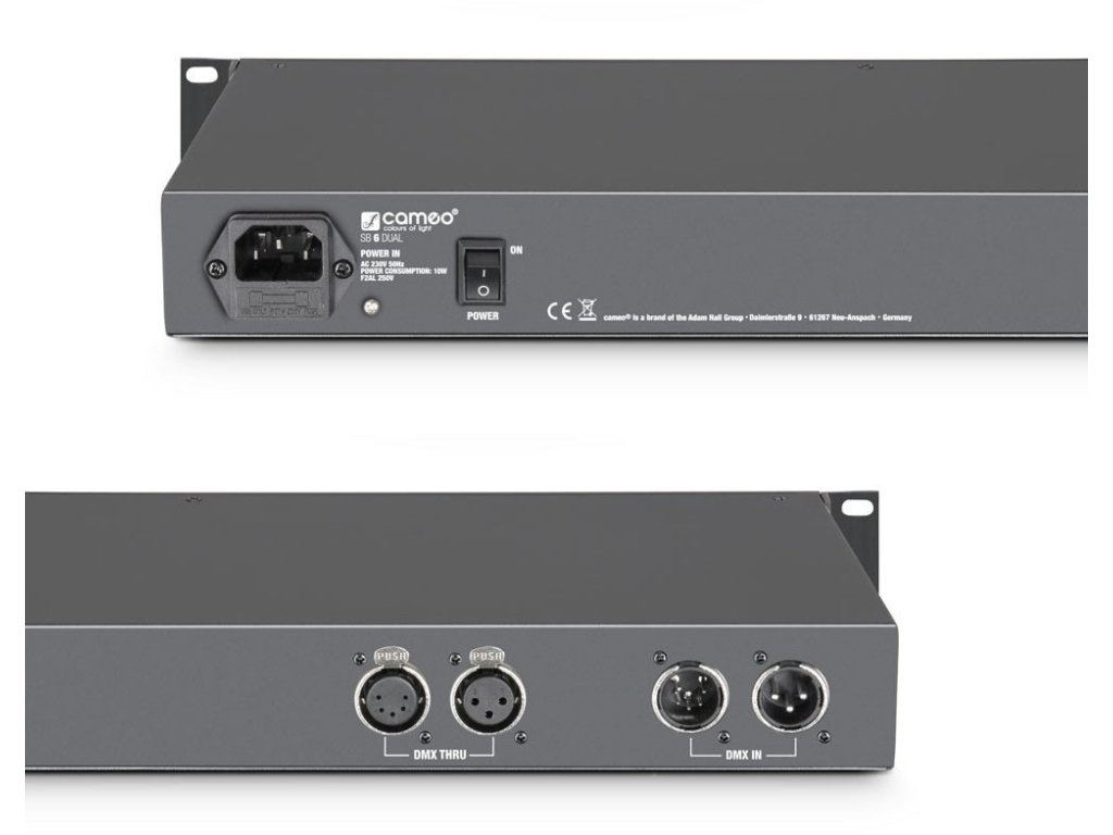 Cameo CLSB6D to profesjonalne rozwiązanie do konfiguracji sieci DMX. Splitter i booster w formacie 19" wzmacnia sygnał wejściowy DMX i rozprowadza go do 6 galwanicznie odseparowanych wyjść. Podłącza się bezpośrednio do konsoli DMX lub urządzeń DMX. Wejście i gniazdo THRU do zapętlania sygnału znajdują się z przodu - a tylna część CLSB6D jest zaprojektowana podwójnie i połączona równolegle. Jasne diody LED na panelu przednim wskazują połączenie DMX i stan zasilania kanałów, wyjścia znajdują się z tyłu i mają rezystor końcowy 120 omów, który można przełączyć na wyjście DMX THRU, kabel IEC jest dołączony do zestawu. Dla wygodnego dostępu do wszystkich przyłączy i instalacji obróconej o 180° można zamontować uchwyty rack z tyłu urządzenia.