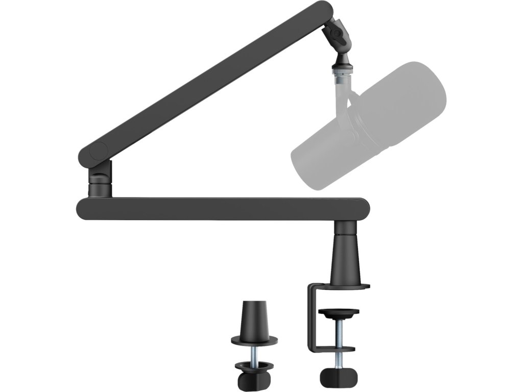 Ramię statywu o długości 710 mm umożliwia płynną regulację wysokości od 0 do 555 mm, dzięki czemu łatwo dopasujesz mikrofon do swojej aktualnej pozycji – niezależnie od tego, czy siedzisz, czy stoisz. Montaż jest możliwy za pomocą praktycznego zacisku biurkowego lub przez przelotkę, co oszczędza miejsce na powierzchni roboczej.