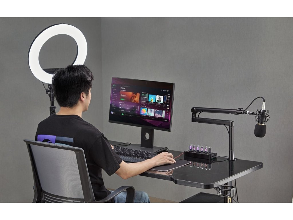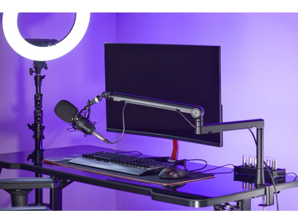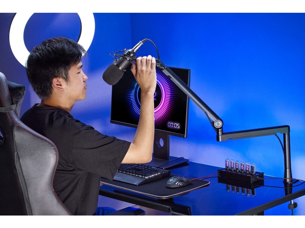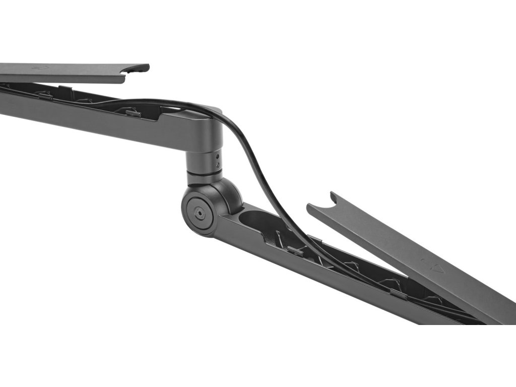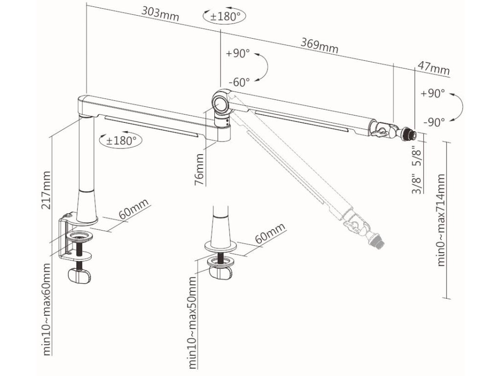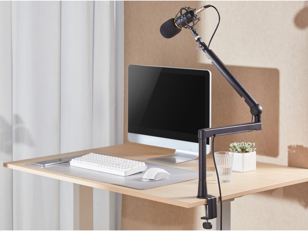 Ramię mikrofonowe o szerokiej kompatybilności, z wbudowanym organizerem kabli i możliwością obrotu ramienia o 360 stopni. Ramię można przymocować do krawędzi stołu o maksymalnej grubości blatu 6 cm, jak również do otworu w blacie. Zastosowany materiał: stal, plastik i aluminium. Gwint 3/8″ i 5/8″.