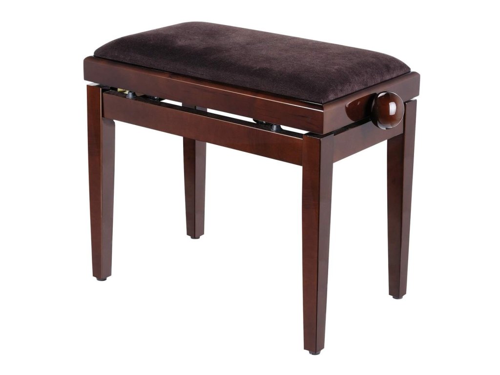 Taboret do pianina o klasycznym kroju z łatwą regulacją wysokości i wygodnym siedziskiem pokrytym czarnym aksamitem. Siedziska produkowane są w wersji błyszczącej i matowej i są dostępne w kilku wersjach kolorystycznych odpowiadających najczęstszym kolorom pianin i fortepianów.