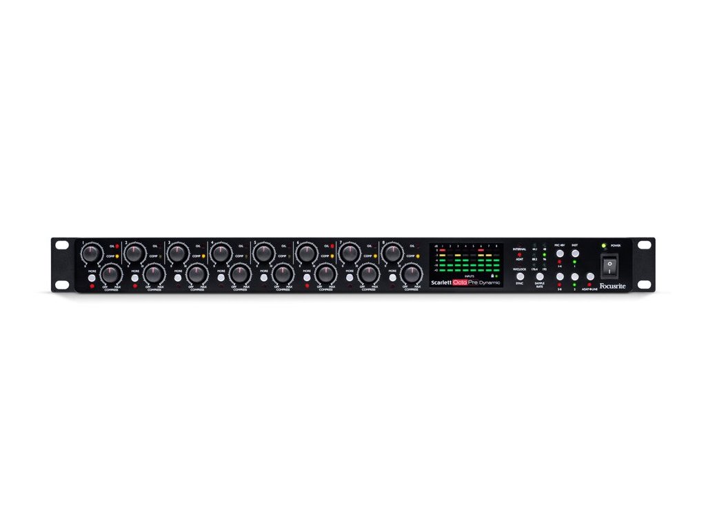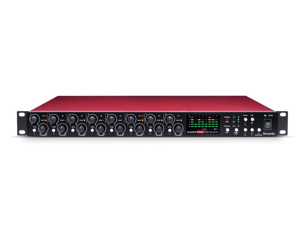 Focusrite Scarlett OctoPre to ośmiokanałowy przedwzmacniacz mikrofonowy i przetwornik AD / DA z cyfrowym interfejsem ADAT. Druga generacja przedwzmacniaczy mikrofonowych pracuje w rozdzielczości 24 bit/192 kHz i oferuje zakres dynamiczny do 109 dB. Dwa analogowe wejścia umieszczone na panelu przednim są w stanie przetwarzać mikrofonowy, liniowy lub bezpośredni sygnał instrumentalny (Hi-Z). OctoPre to idealne studyjne uzupełnienie do rozszerzenia łączności kart dźwiękowych serii Scarlett i innych urządzeń wyposażonych w interfejs ADAT. Przetwornik jest przystosowany do instalacji w racku, gdzie zajmuje jedną jednostkę wysokości.