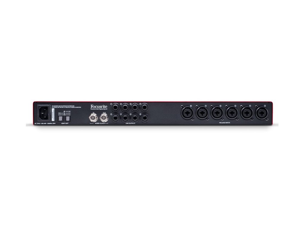 Scarlett OctoPre dysponuje ośmioma analogowymi wejściami z kombinowanymi złączami XLR/TRS. Każdy kanał wejściowy jest wyposażony w regulator głośności i przełącznik tłumienia (-8 dB). Użytkownik ma możliwość wyboru czułości wejściowej (LINE/INST) dla kanałów 1 i 2. Sygnał można kierować do ośmiu wyjść cyfrowych (optyczny interfejs ADAT) lub ośmiu analogowych (TRS). Siłę sygnału wskazują kolorowe diody LED na przejrzystym panelu. Komunikację z innymi urządzeniami studyjnymi zapewnia terminal synchronizacyjny BNC dla WordClock. Częścią dołączonego wyposażenia jest pakiet oprogramowania zawierający wtyczki Red Plug-in Suite (Focusrite), Time and Tone Bundle (Softube), Plug-in Collective (Focusrite).