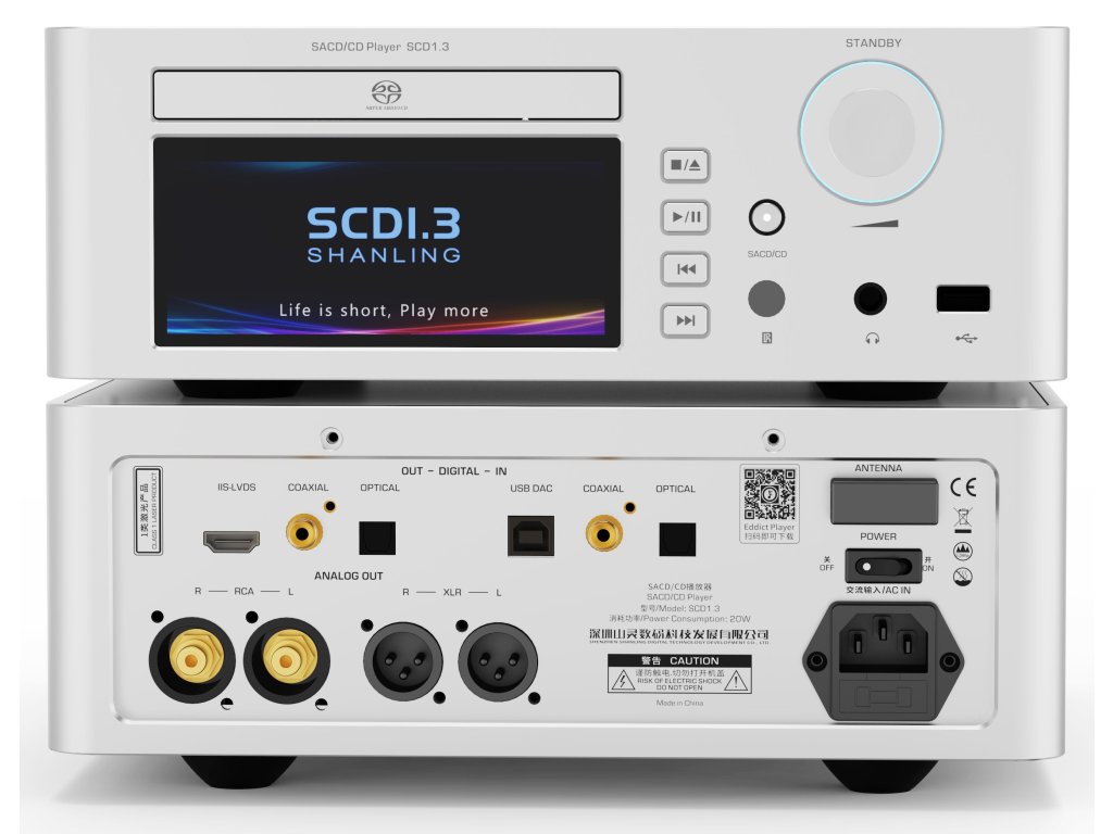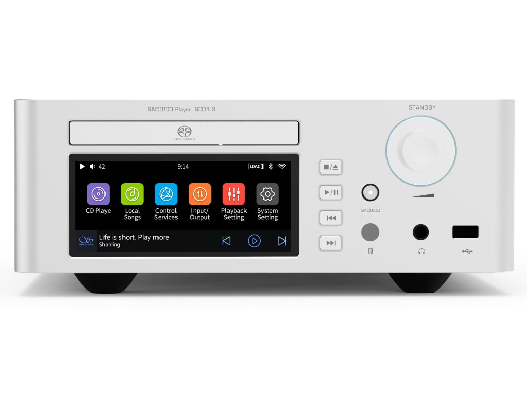 Dzięki swojemu modelowi SCD1.3, Shanling prezentuje flagowy odtwarzacz SACD CD, który zawiera kombinację układów DAC AKM AK4499EX + AK4191EQ, interfejs USB XMOS XU316 oraz wzmacniacz słuchawkowy TPA6120. Wielofunkcyjny Shanling SCD1.3 oferuje również wiele innych możliwości wykorzystania. Posiada połączenie Bluetooth, port USB-A dla U-Disk oraz obsługuje DLNA i AirPlay do połączeń sieciowych. Te dodatkowe funkcje ułatwiają integrację z dowolnym systemem audio. Dodatkowo oferuje dużą ilość wejść i wyjść. Wśród wejść znajdują się USB-B, koaksjalne SPDIF i Toslink optyczne, natomiast cyfrowe wyjścia obejmują I2S przez HDMI, koaksjalne SPDIF i Toslink optyczne. Dostępne są również dwa analogowe wyjścia: analogowe wyjście RCA i symetryczne wyjście XLR.