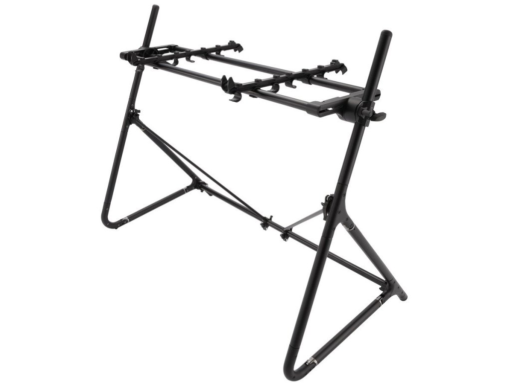 Do statywu dołączone są dwa mocne, polimerowe uchwyty na klawisze. Dzięki ich ustawieniu można dostosować statyw do różnych rozmiarów i typów klawiszy. Dwa mniejsze syntezatory, kontrolery lub inne podobne urządzenia można ustawić obok siebie w rzędzie. W przypadku dwóch poziomów wysokości możesz przysunąć dolny instrument do siebie, a górny odsunąć, aby się wzajemnie nie zakrywały i były oba dobrze dostępne. Podczas transportu uchwyty te można również złożyć, dzięki czemu cały stojak będzie bardzo kompaktowy.