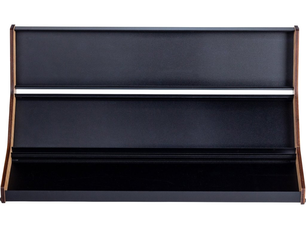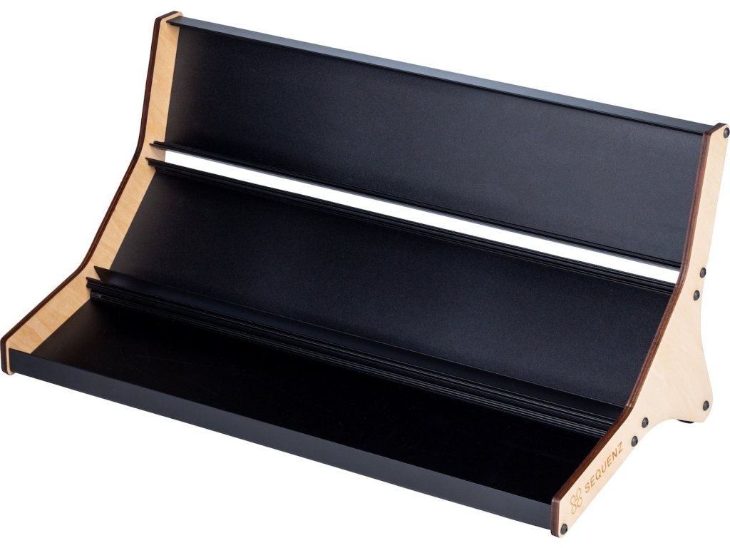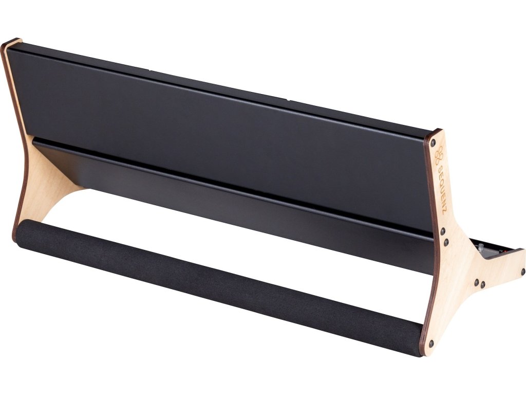 Asymetryczne panele boczne umożliwiają przechylenie stojaka tak, aby był głębszy lub wyższy, i jest on wyposażony w drewniane zakończenia dla większej solidności i wspaniałego wyglądu.