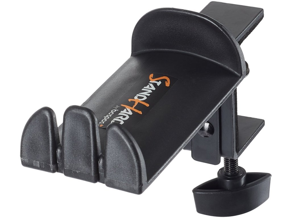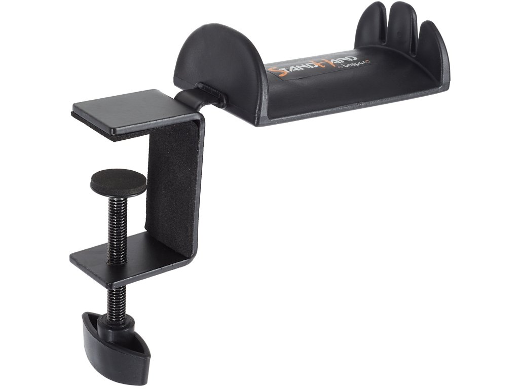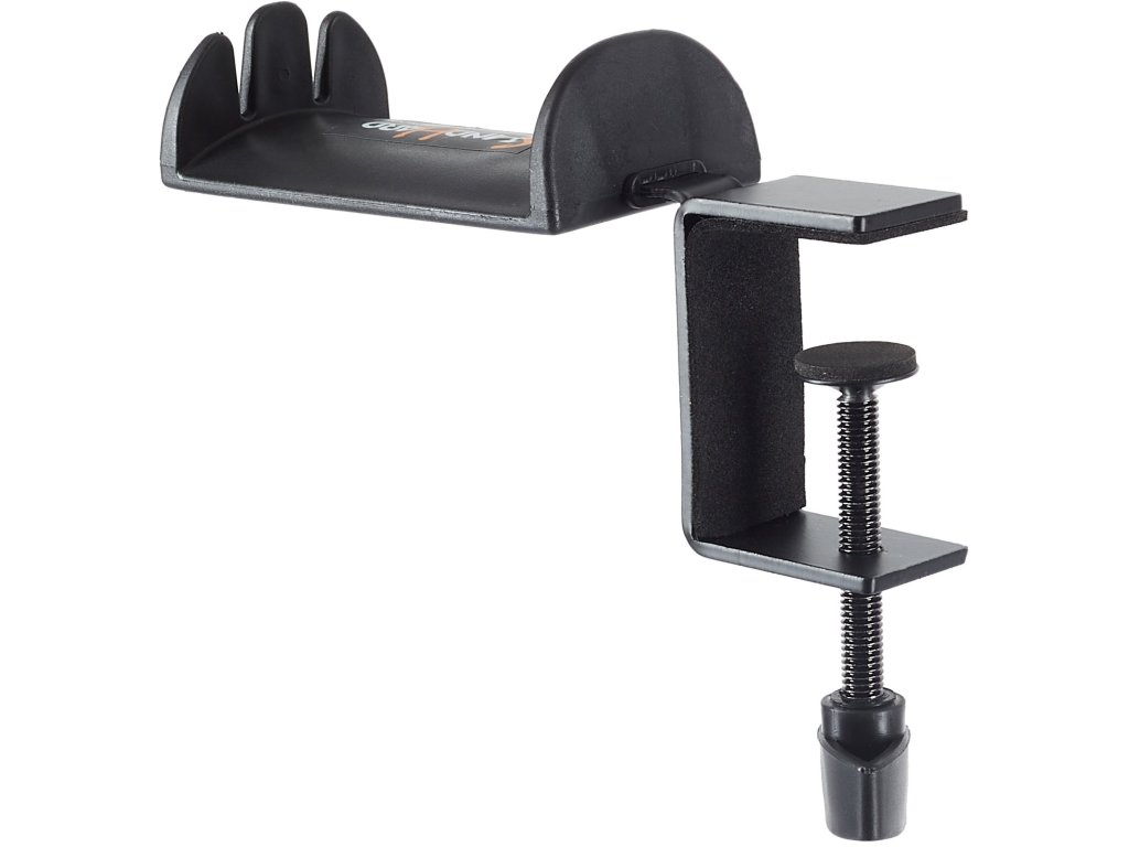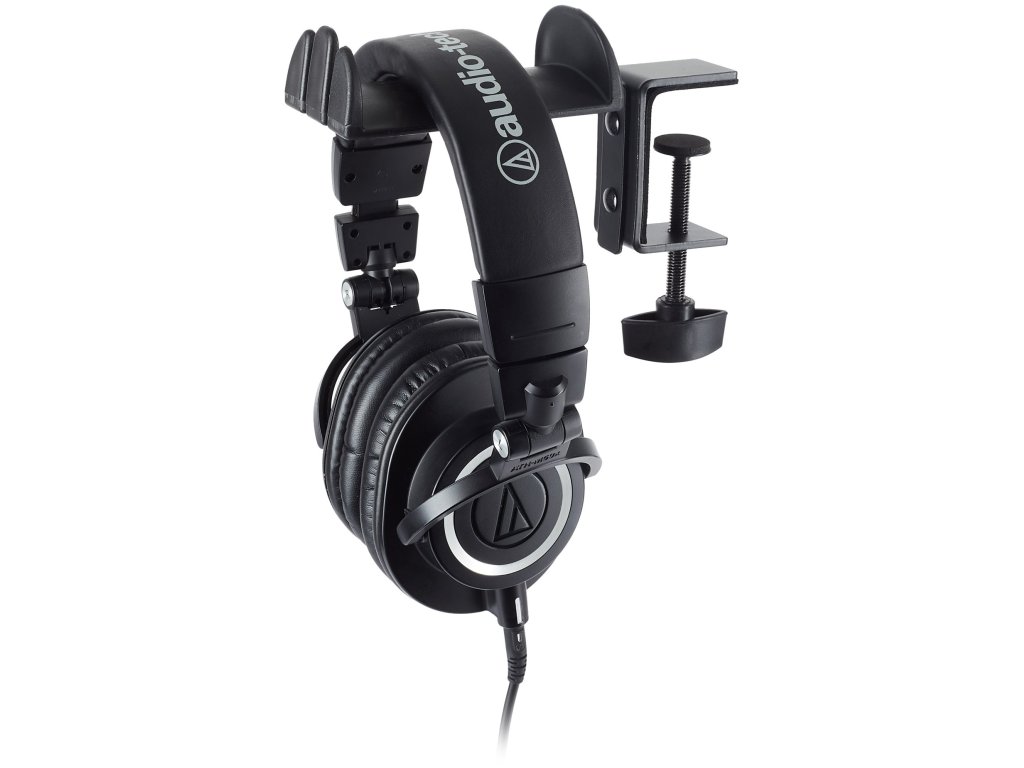 Praktyczny uchwyt na słuchawki wykonany jest z wytrzymałej stali i zapewnia maksymalny komfort dla Twoich słuchawek, które są nieodłączną częścią wyposażenia każdego profesjonalnego i domowego studia nagrań. Uchwyt mocuje się do blatu stołu za pomocą solidnej śruby, powierzchnia do przechowywania pomieści do dwóch par słuchawek studyjnych, a przednia strona posiada wycięcia na parę słuchawek dousznych In-Ear. Uchwyt może być również używany jako powierzchnia do odkładania kabli mikrofonowych i instrumentalnych.
