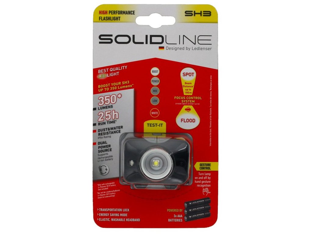 Praktyczna latarka czołowa z zaawansowanymi technologiami i strumieniem świetlnym do 300 lm. Połączenie soczewki i reflektora stworzyło unikalną technologię Advanced Focus System, która nie ma sobie równych na świecie. W ten sposób powstała soczewka reflektorowa umożliwiająca skupienie strumienia światła z płynnym przejściem od szerokiego, homogenicznego kręgu światła do ostrej wiązki i odwrotnie. Ostrość reguluje się poprzez proste przesunięcie głowicy latarki do przodu (ostrość) lub do tyłu (rozmycie). Latarki Solidline wykorzystują zasadę załamania światła. Zwykłe latarki jedynie odbijają światło od powierzchni odblaskowych wewnątrz głowicy latarki. Technologia Dual Power Source to bardzo praktyczna funkcja na długie podróże. Umożliwia wykorzystanie jako źródła energii oryginalnego akumulatora lub baterii AA. Latarka automatycznie rozpoznaje podłączone źródło i dostosowuje moc na podstawie jego parametrów.