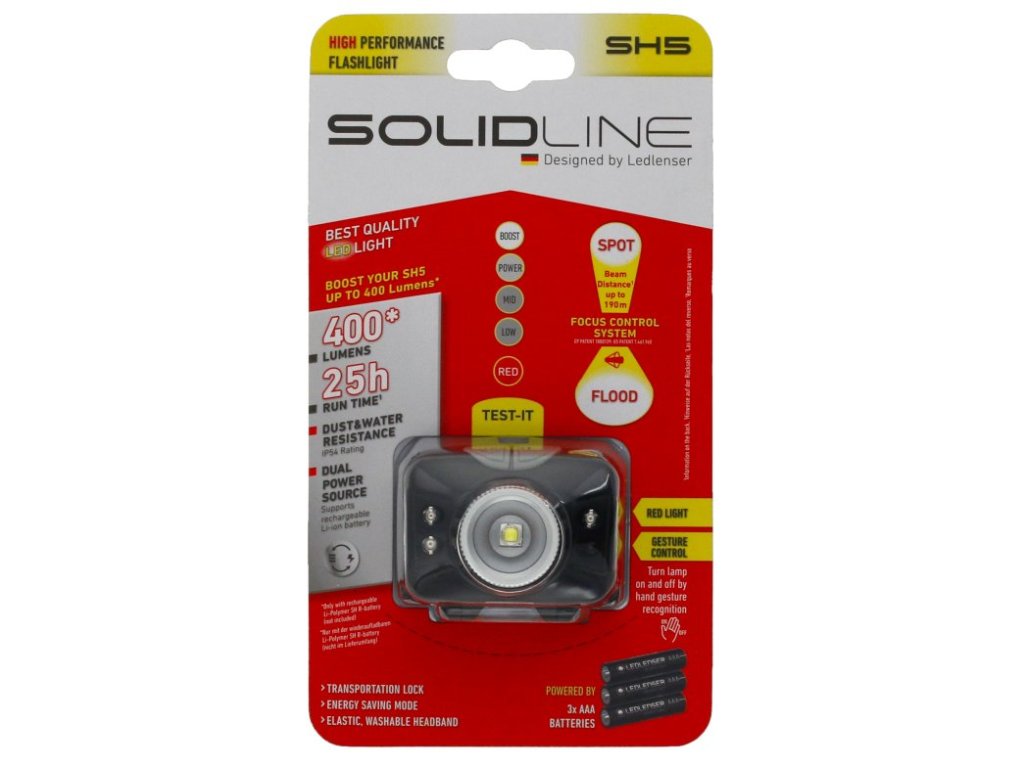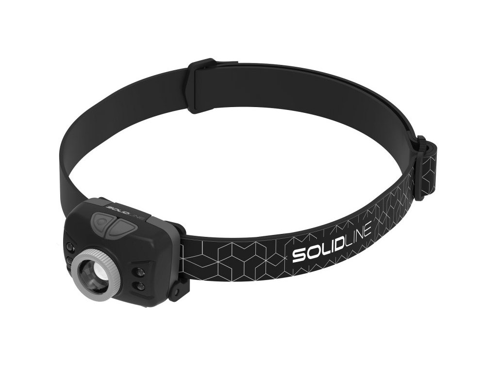 Praktyczna latarka czołowa z zaawansowanymi technologiami i strumieniem świetlnym do 350 lm. Połączenie soczewki i reflektora stworzyło unikalną technologię Advanced Focus System, która nie ma sobie równych na świecie. W ten sposób powstała soczewka reflektorowa umożliwiająca skupienie strumienia światła z płynnym przejściem od szerokiego, homogenicznego kręgu światła do ostrej wiązki i odwrotnie. Ostrość reguluje się poprzez proste przesunięcie głowicy latarki do przodu (ostrość) lub do tyłu (rozmycie). Latarki Solidline wykorzystują zasadę załamania światła. Zwykłe latarki jedynie odbijają światło od powierzchni odblaskowych wewnątrz głowicy latarki. Technologia Dual Power Source to bardzo praktyczna funkcja na długie podróże. Umożliwia wykorzystanie jako źródła energii oryginalnego akumulatora lub baterii AA. Latarka automatycznie rozpoznaje podłączone źródło i dostosowuje moc na podstawie jego parametrów.