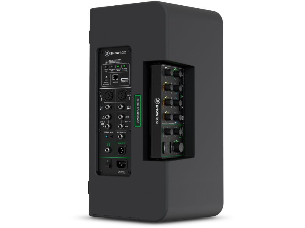 Mackie SHOWBOX to zasilany bateryjnie aktywny zestaw głośnikowy ze zdejmowanym sześciokanałowym mikserem, procesorem efektów i interfejsem audio USB. Miej wszystko w zasięgu ręki dzięki odłączanemu modułowi sterowania miksem, który umożliwia ustawianie poziomów dla mikrofonów i instrumentów, sterowanie efektami, korekcję, korzystanie z zapisu ustawień, loopera, tunera i innych funkcji. Sterownik mocuje się do statywu mikrofonowego, a po akcji wsuwa się go do obudowy samego zestawu głośnikowego. Użyj procesora efektów do wzbogacenia dźwięku na każdym z czterech kanałów mikrofonowych i instrumentalnych, w tym specyficznych efektów, takich jak fuzz, overdrive, saturacja lampowa, przedwzmacniacz akustyczny, symulacje wzmacniaczy, tremolo i inne. Następnie połącz wszystko za pomocą dwóch dodatkowych procesorów efektów dla efektów pogłosowych, takich jak delay i reverb. Użyj 3-pasmowego parametrycznego korektora i kompresora na każdym kanale. Mackie ShowBox zapewnia do 12 godzin dźwięku na żywo o mocy 400 W dzięki wewnętrznemu akumulatorowi. 6 kanałów wejściowych dla mikrofonów i instrumentów zapewnia wystarczającą zmienność, aby ShowBox stał się kompletnym rozwiązaniem przenośnego dźwięku na żywo dla wokalistów, gitarzystów, klawiszowców i innych artystów. Mackie ShowBox połączy Cię z publicznością, gdziekolwiek jesteś. Uprość konfigurację na żywo i dodaj możliwość nagrywania za pomocą karty SD, przesyłania strumieniowego przez USB-C i korzystania z Bluetooth do odtwarzania utworów akompaniujących (lub muzyki podczas przerwy). Żadnego wzmacniacza? Żaden problem. Dzięki przełączanym trybom PA / Amp, wewnętrznym efektom dla gitary i wokalu, pętli efektów dla pedałów oraz ustawieniom dla występów w pomieszczeniach i na zewnątrz, ShowBox może zastąpić tradycyjny wzmacniacz, a jednocześnie otworzyć nowe możliwości twórcze dla artystów solowych i małych zespołów.