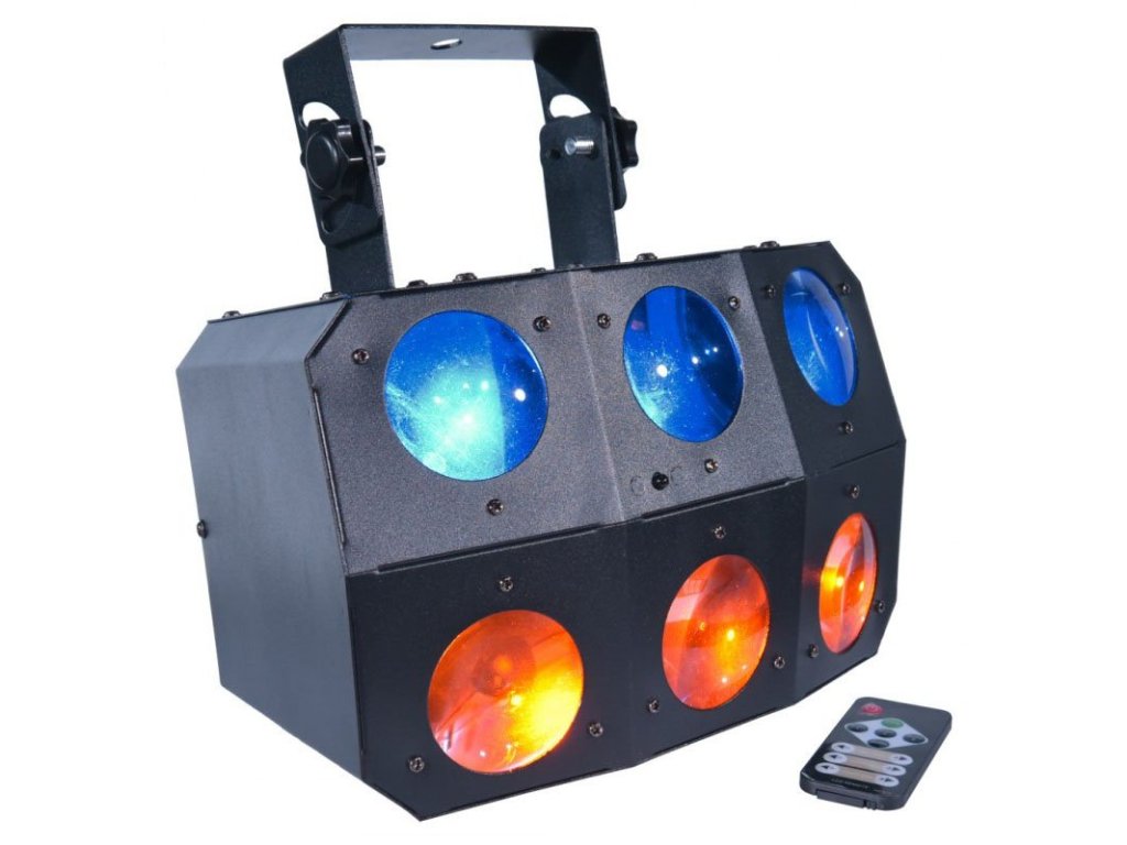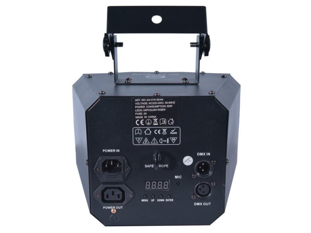 LIGHT4ME SIX EYE BEAM to mocny efekt derby, którym można sterować za pomocą bezprzewodowego pilota. Przeznaczony do klubów, dyskotek lub mobilnych imprez. Urządzenie jest wyposażone w system optyczny składający się z sześciu obiektywów, za którymi znajduje się łącznie 24 diody LED o mocy 3 watów. Pracują w palecie kolorów RGBW i tworzą bardzo żywe i nasycone kolory.