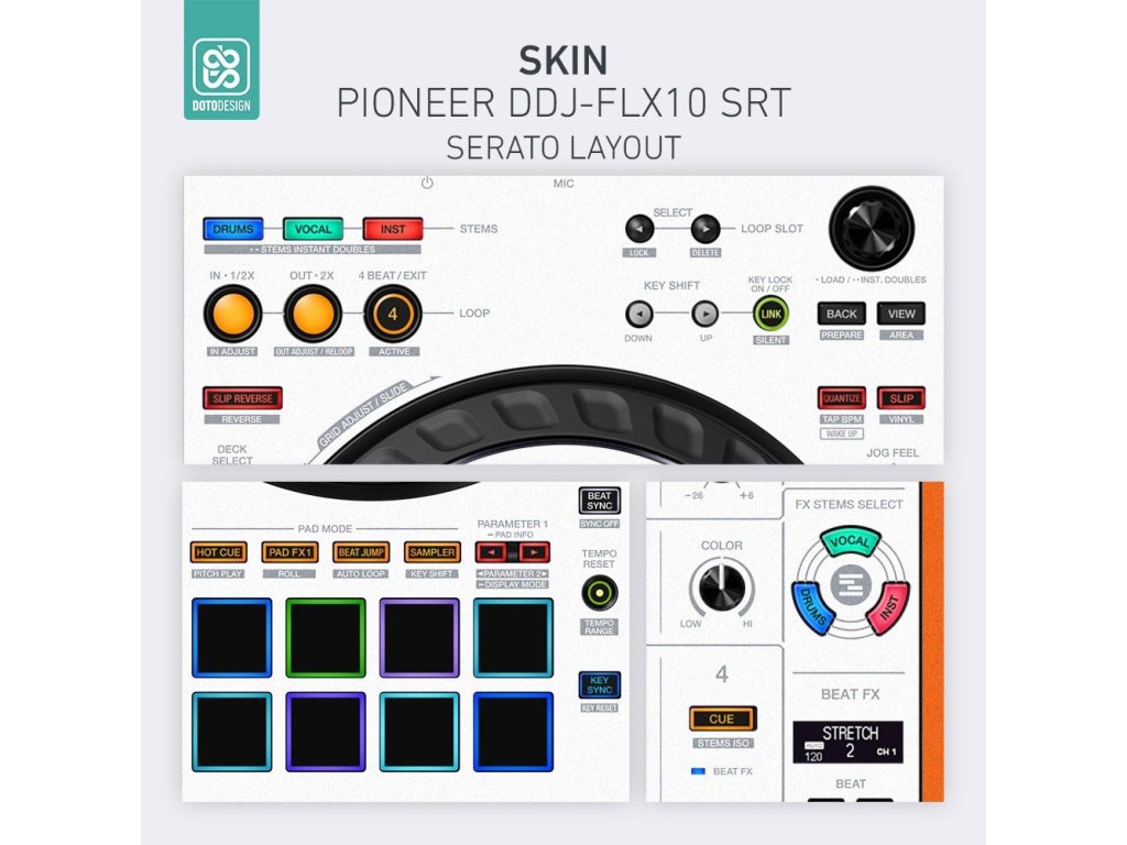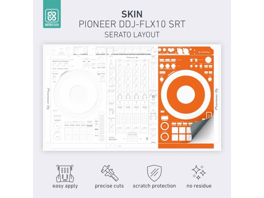 Naklejka na kontroler MIDI Pioneer DDJ-FLX10 (layout Serato DJ Pro) w wersji z asymetrycznym designem, kolor pomarańczowo-biały.