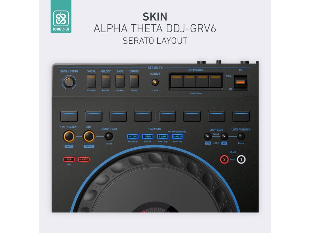 Naklejka na kontroler MIDI AlphaTheta DDJ-GRV6 (layout Serato DJ Pro) w wersji COLORS DVS, kolor blue (niebieski).
