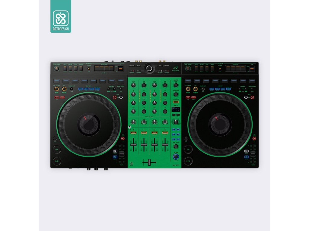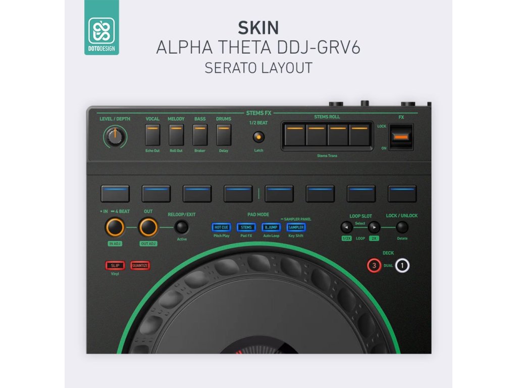 Naklejka na kontroler MIDI AlphaTheta DDJ-GRV6 (layout Serato DJ Pro) w wersji COLORS DVS, kolor zielony.