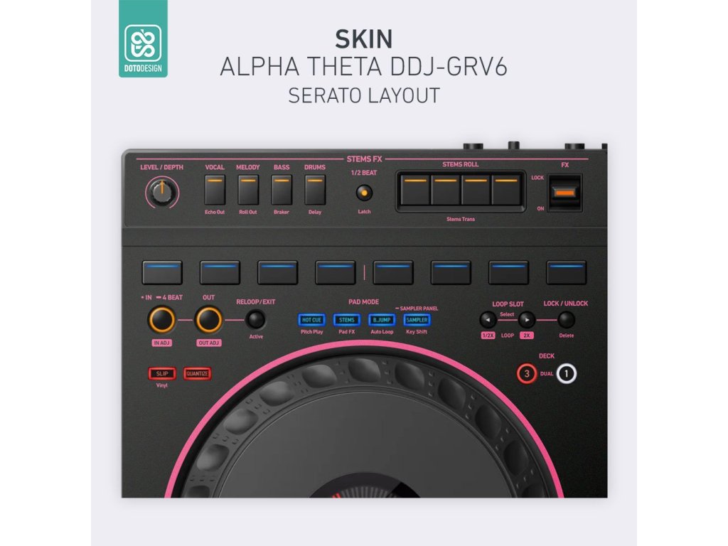 Naklejka na kontroler MIDI AlphaTheta DDJ-GRV6 (layout Serato DJ Pro) w wersji COLORS DVS, kolor różowy (pink).