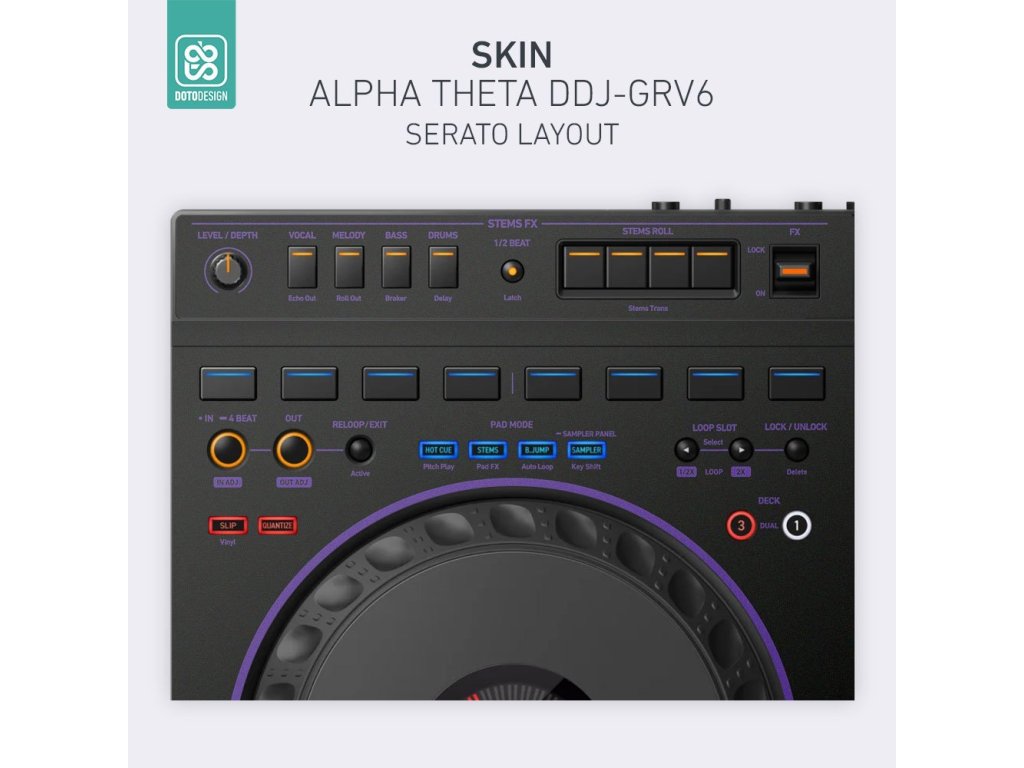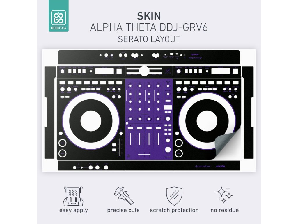 Naklejka na kontroler MIDI AlphaTheta DDJ-GRV6 (layout Serato DJ Pro) w wersji COLORS DVS, kolor purple (fioletowy).