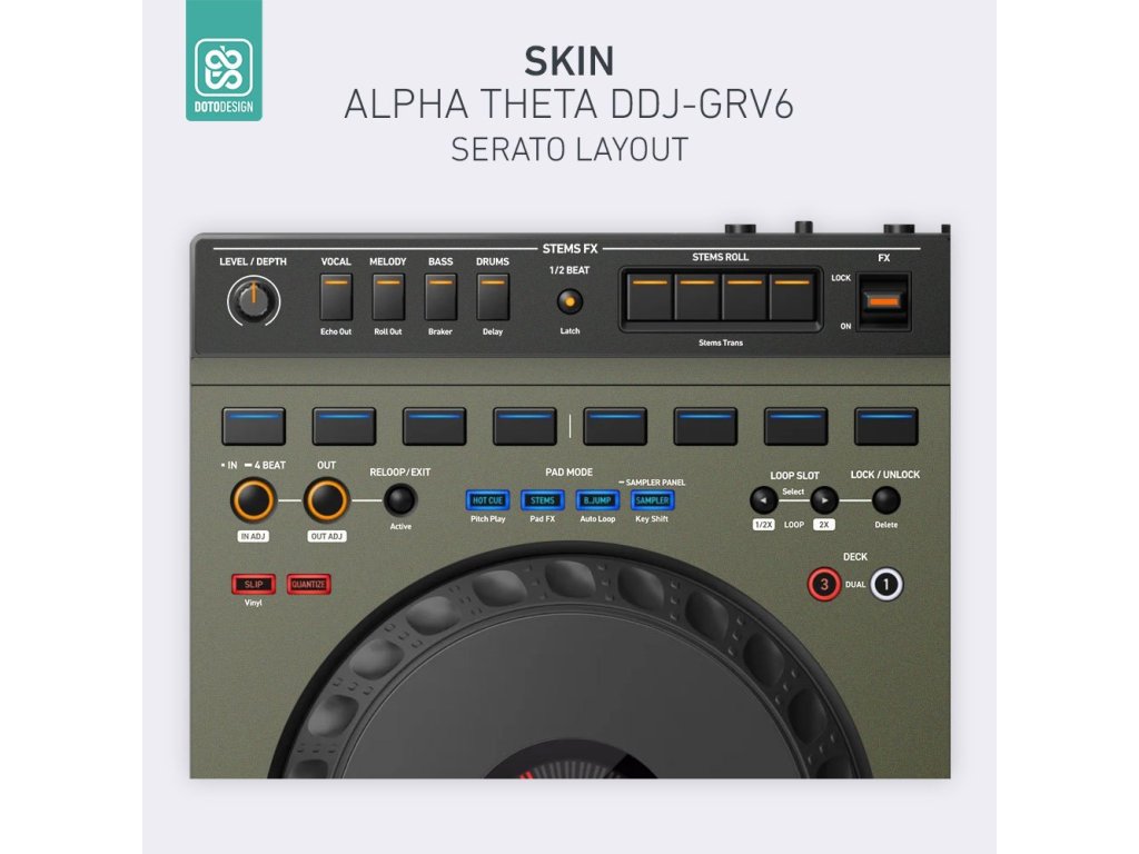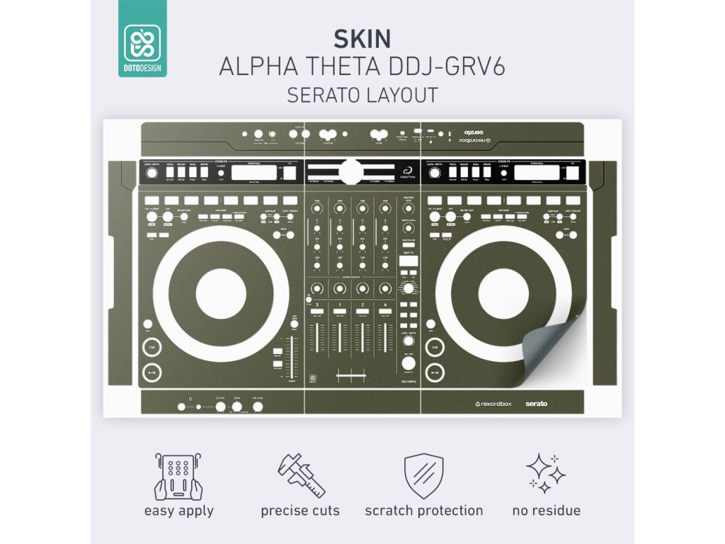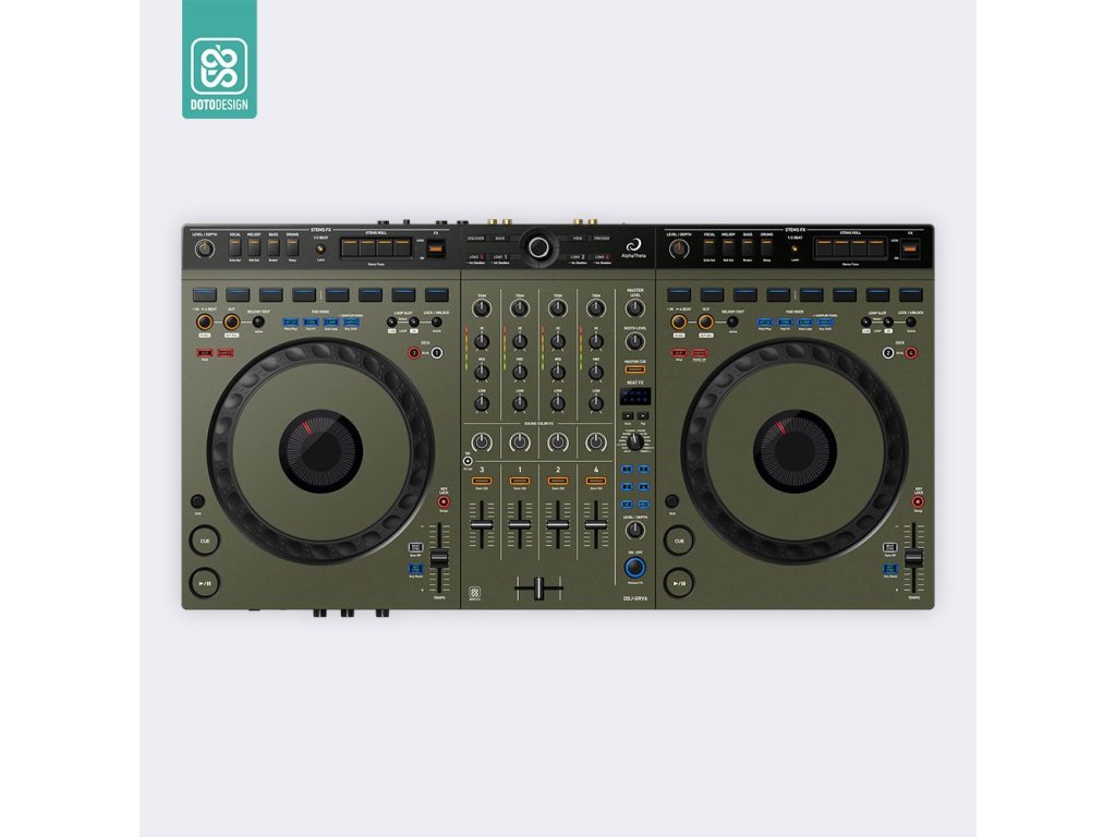 Naklejka na kontroler MIDI AlphaTheta DDJ-GRV6 (layout Serato DJ Pro) w wersji FULL COLORS, kolor army green (wojskowa zieleń).