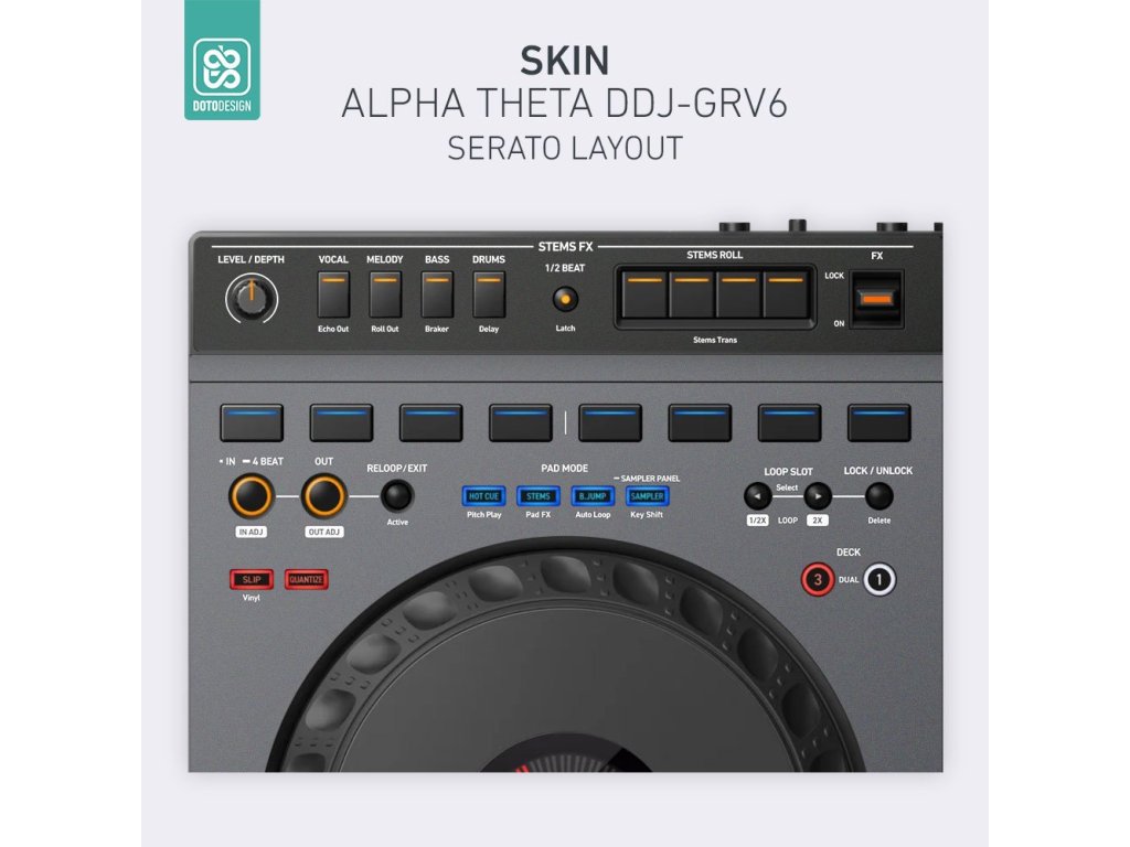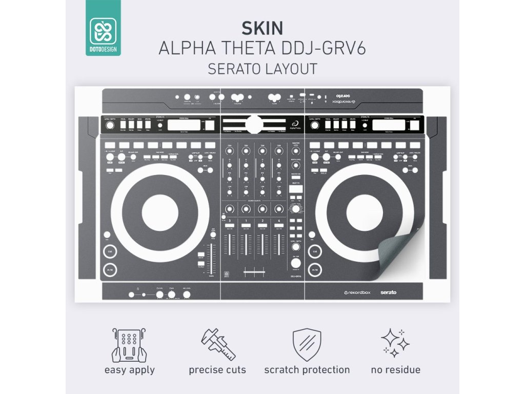 Naklejka na kontroler MIDI AlphaTheta DDJ-GRV6 (layout Serato DJ Pro) w wersji FULL COLORS, kolor graphite grey (grafitowa szarość).