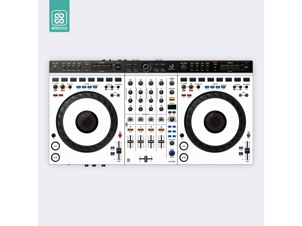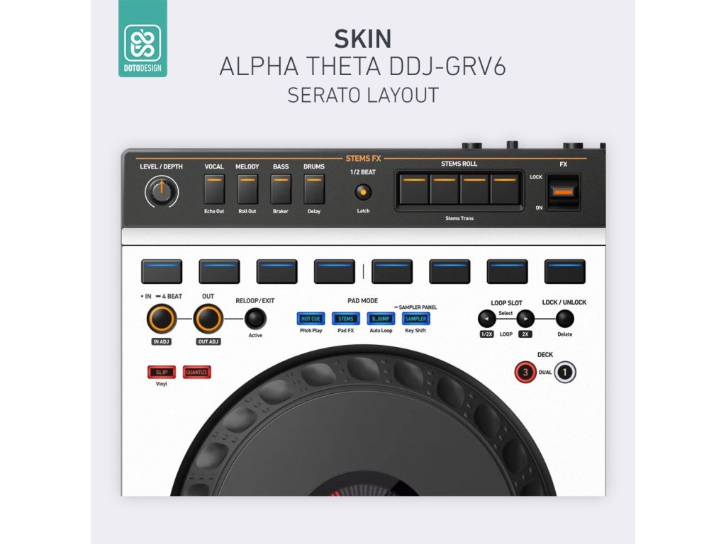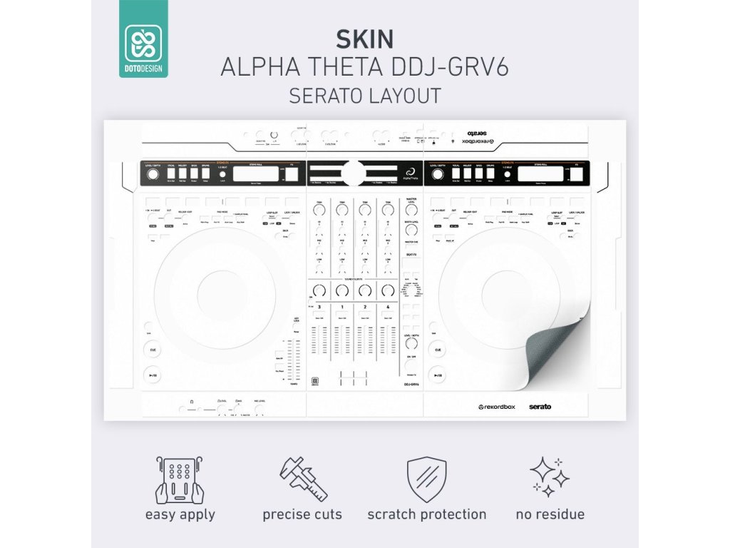 Naklejka na kontroler MIDI AlphaTheta DDJ-GRV6 (layout Serato DJ Pro) w wersji FULL COLORS, kolor biały.