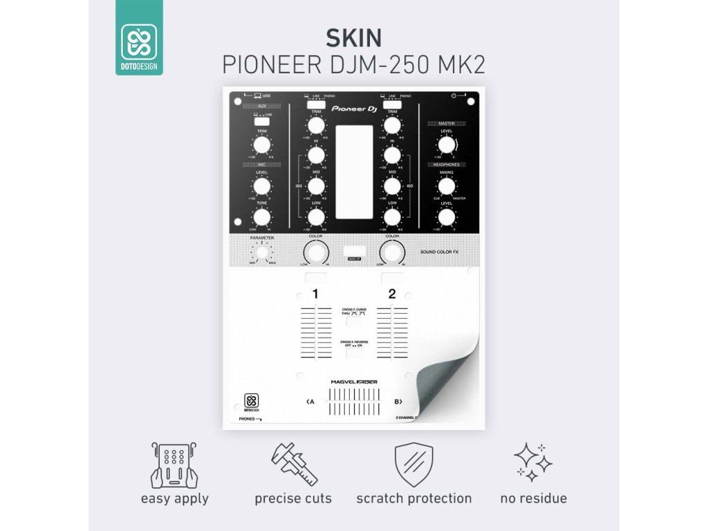 Naklejki Doto Design są idealne do personalizacji wyglądu Twojego sprzętu DJ-skiego (mikserów, gramofonów, odtwarzaczy, kontrolerów). Dostępna jest szeroka gama kolorów i ekskluzywnych wzorów, aby stworzyć niepowtarzalny wygląd. Skórki są precyzyjnie wykonane z materiałów premium, posiadają matową powłokę antyrefleksyjną i chronią Twój sprzęt przed zarysowaniami i zużyciem. Dzięki nowej warstwie adhezyjnej aplikacja jest bardzo prosta, a w przypadku usunięcia skórki na sprzęcie nie pozostaną żadne ślady ani resztki kleju.