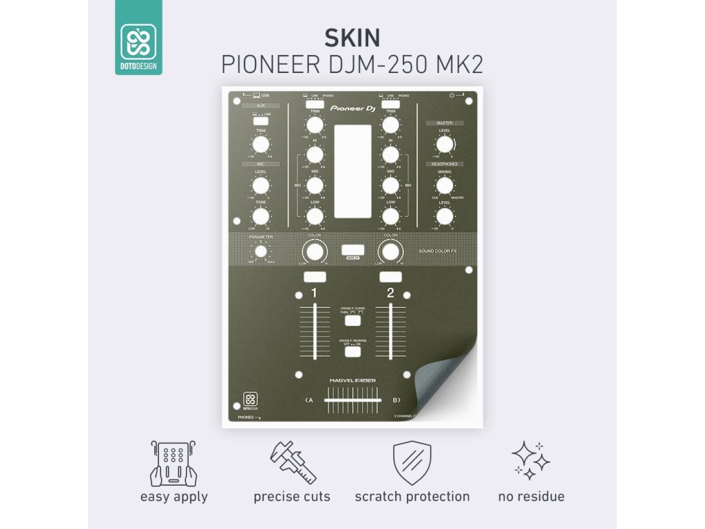 Naklejki Doto Design są idealne do personalizacji wyglądu Twojego sprzętu DJ-skiego (mikserów, gramofonów, odtwarzaczy, kontrolerów). Dostępna jest szeroka gama kolorów i ekskluzywnych wzorów, aby stworzyć niepowtarzalny wygląd. Skórki są precyzyjnie wykonane z materiałów premium, posiadają matową powłokę antyrefleksyjną i chronią Twój sprzęt przed zarysowaniami i zużyciem. Dzięki nowej warstwie adhezyjnej aplikacja jest bardzo prosta, a w przypadku usunięcia skórki na sprzęcie nie pozostaną żadne ślady ani resztki kleju.