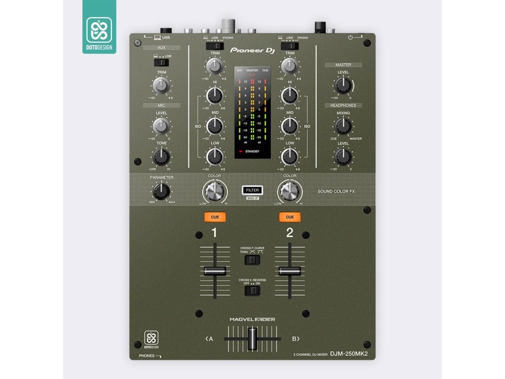 Naklejka na mikser Pioneer DJM-250 MK2 w wersji FULL COLORS, kolor army green (wojskowa zieleń).