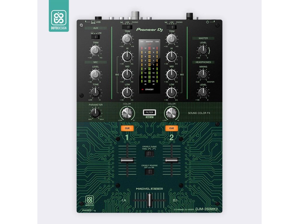 Naklejka na mikser Pioneer DJM-250 MK2 w wersji TECH, inspirowana światem elektroniki w futurystycznym stylu. Kolor light green (jasnozielony).