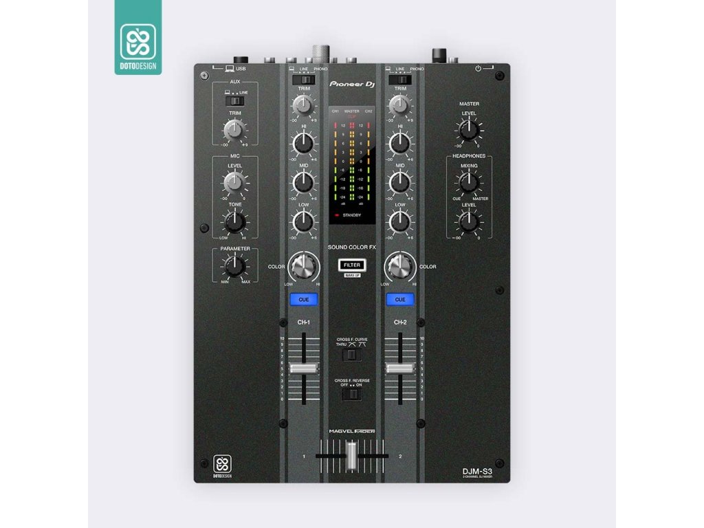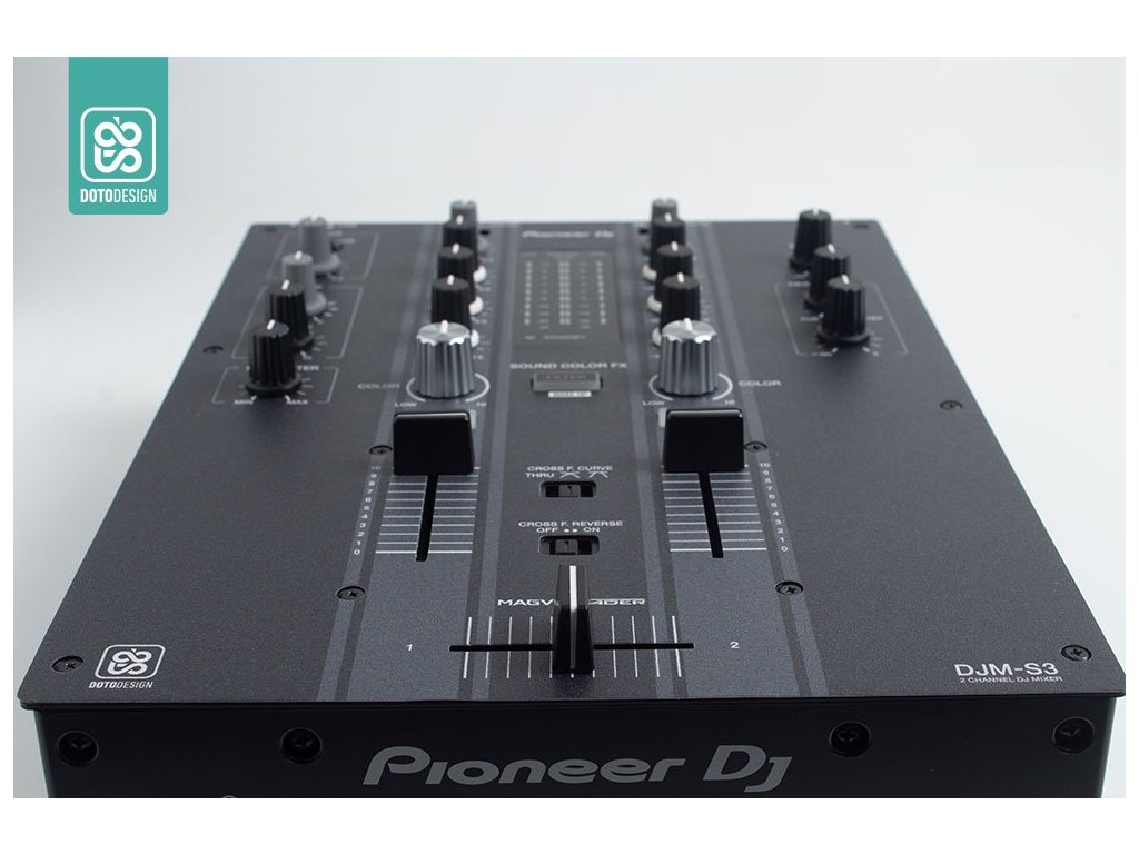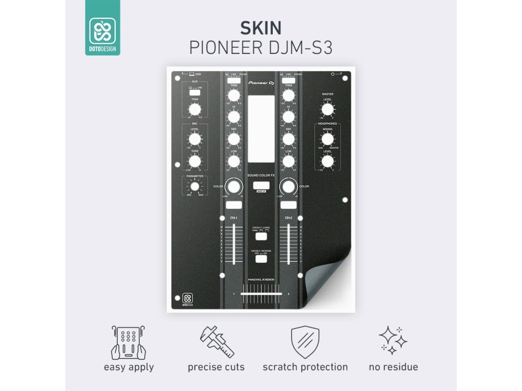 Naklejka na mikser Pioneer DJM-S3 w wersji Classic Edition, którego design inspirowany jest klasycznymi modelami mikserów Pioneer DJM-909 i DJM-707. Kolor black (czarny).