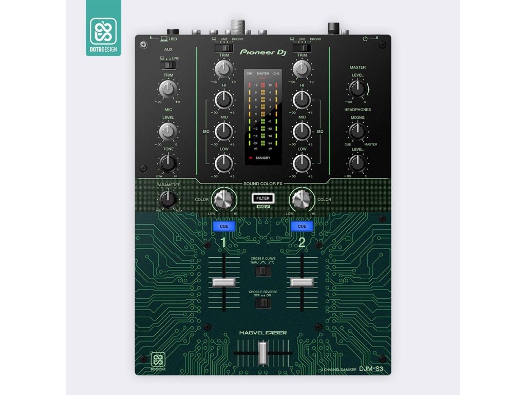 Naklejka na mikser Pioneer DJM-S3 w wersji TECH, inspirowana światem elektroniki w futurystycznym stylu. Kolor light green (jasnozielony).