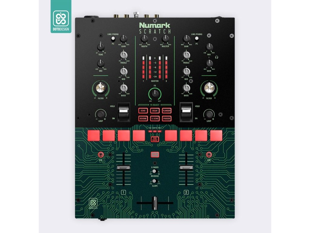 Naklejka na mikser Numark Scratch w wersji TECH, inspirowana światem elektroniki w futurystycznym stylu. Kolor light green (jasnozielony).