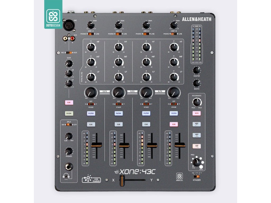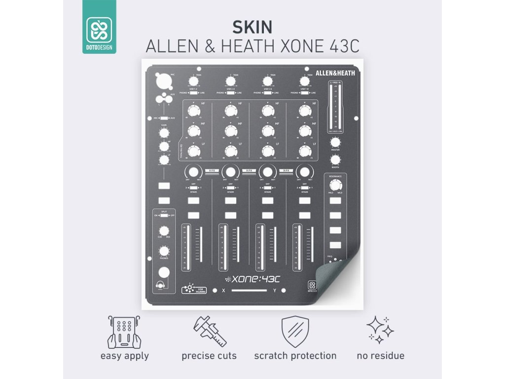 Naklejka na panel mikserski Allen & Heath XONE:43C w wersji FULL COLORS, kolor graphite grey (grafitowa szarość).