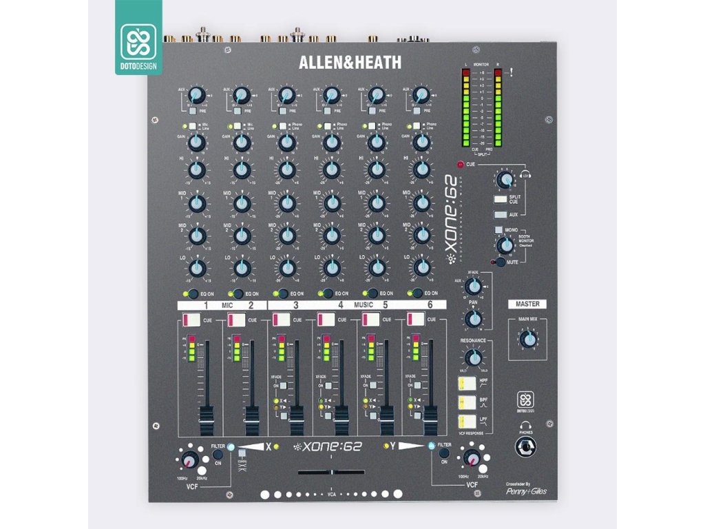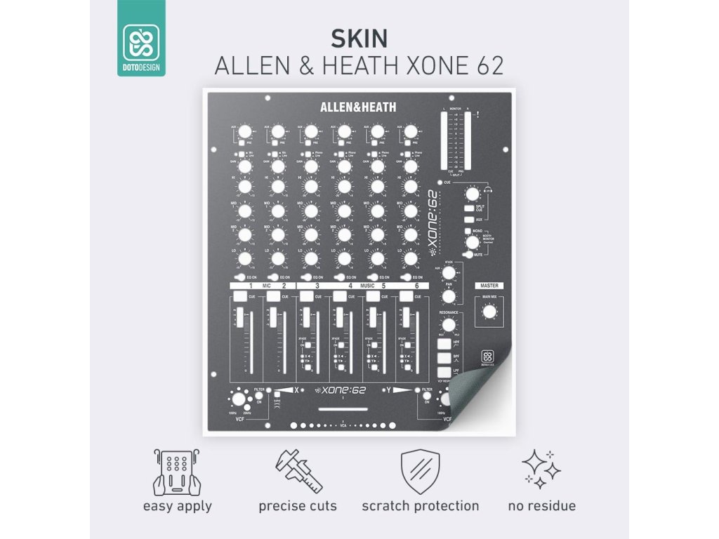 Naklejka na mikser Allen & Heath XONE:62 w wersji FULL COLORS, kolor graphite grey (grafitowa szarość).
