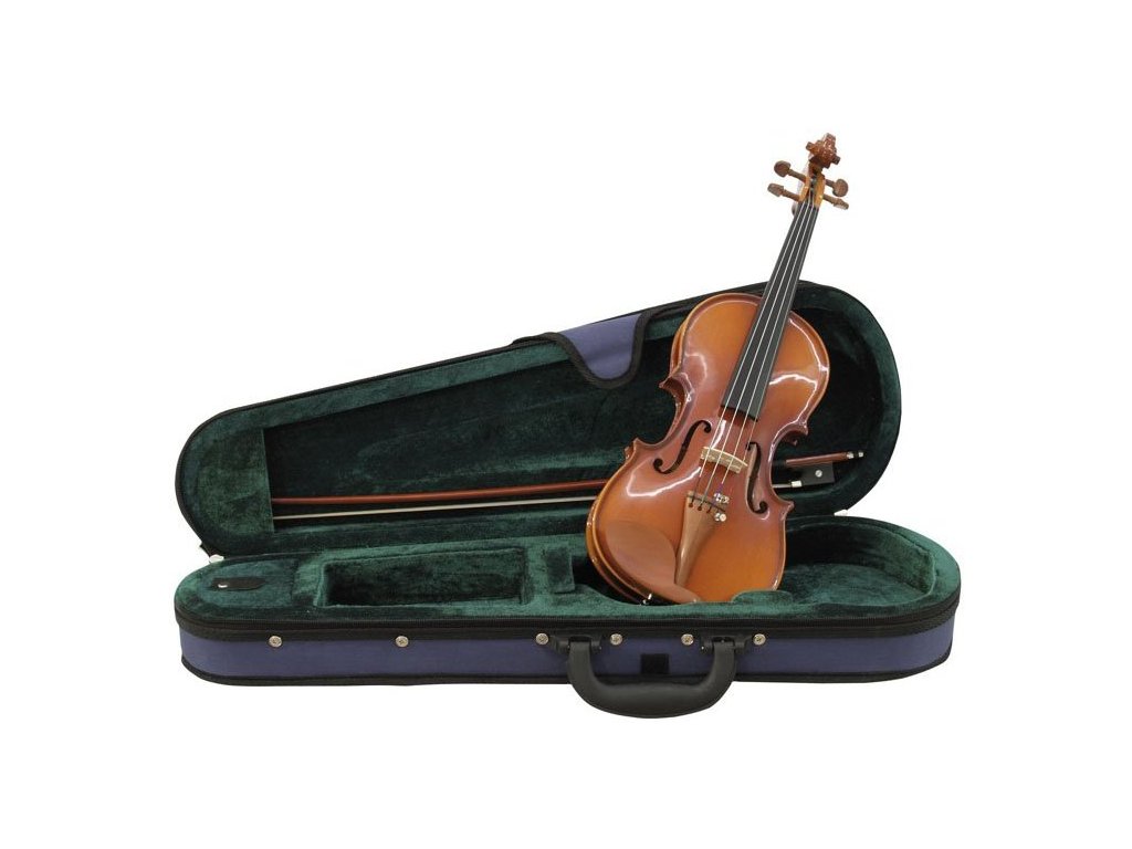 Skrzypce 1/4. Korpus klonowy, strunnik, kołki stroikowe i podstrunnica z ebonizowanego drewna twardego. W zestawie futerał, smyczek i kalafonia.