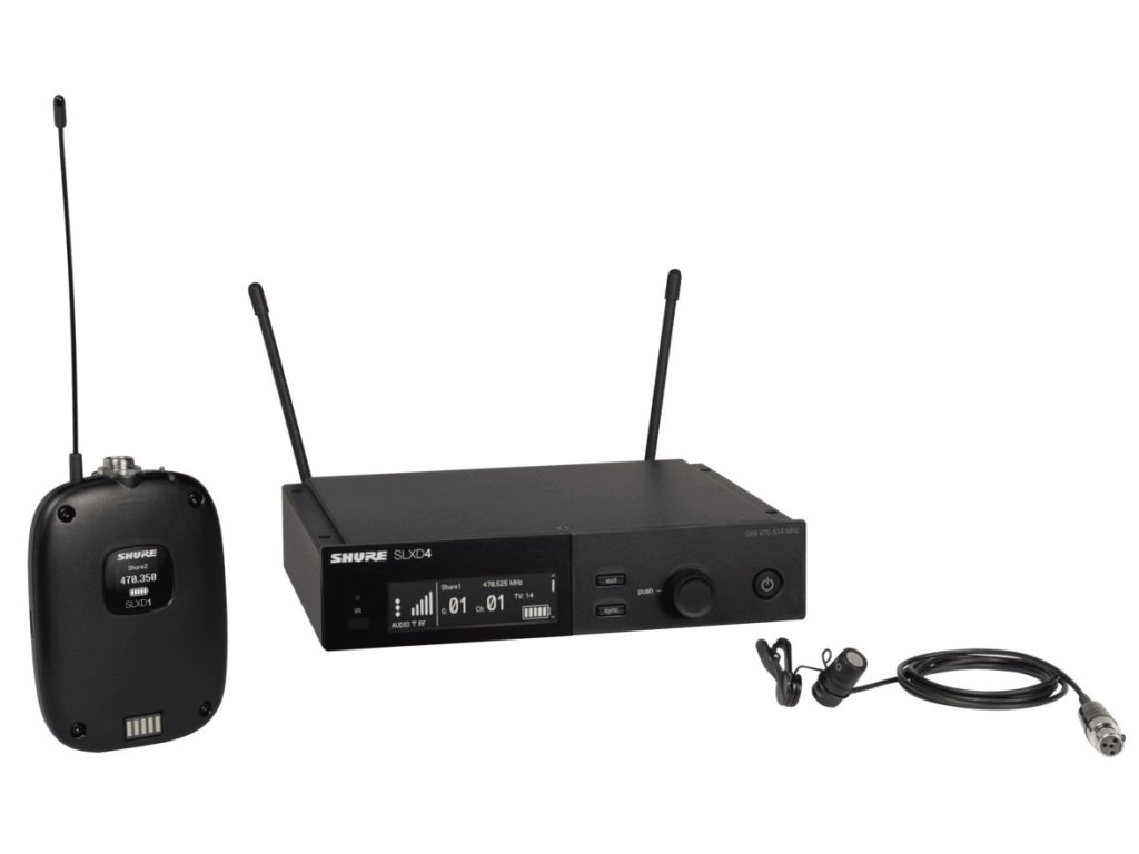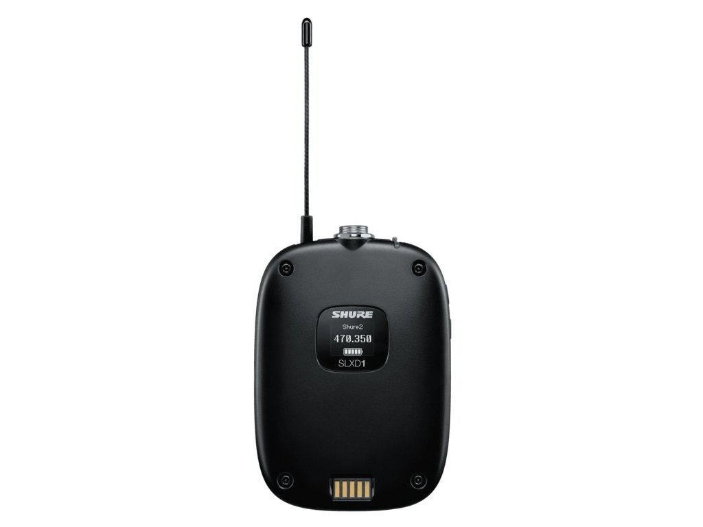 Bodypack SLXD1 jest wyposażony w czteropinowe mini złącze TQG, które służy do podłączenia dołączonego mikrofonu. Nadajnik jest w stanie pracować do 8 godzin na jednym ładowaniu. Do zasilania można użyć dwóch baterii AA lub akumulatora Shure SB903. Mikrofon pojemnościowy WL185 z kardioidalną charakterystyką kierunkową zapewnia czysty, niezakłócony dźwięk w całym spektrum od 50 Hz do 17 kHz. Pasmo przenoszenia jest dostosowane do nagrywania mowy.