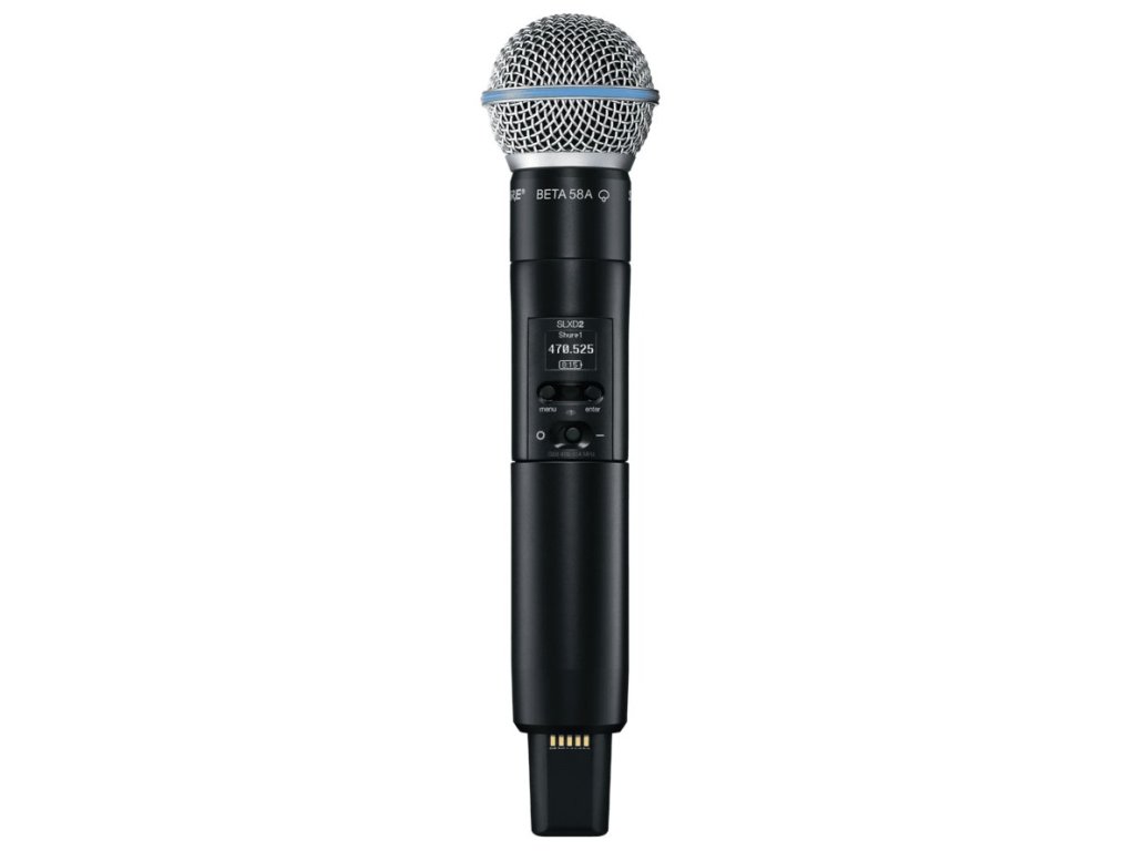 Do sterowania służy wyświetlacz LCD o wysokim kontraście i dwa przyciski nawigacyjne. Szybkie uruchomienie zestawu ułatwia automatyczne parowanie IR odbiornika z nadajnikiem. W zależności od wybranego trybu pracy można bez niepożądanych interferencji obsługiwać do 12 systemów jednocześnie. Nadajnik jest wyposażony w dynamiczną kapsułę mikrofonową Beta 58A, która zapewnia czysty, niezakłócony dźwięk w całym spektrum od 50 Hz do 16 kHz. Jej charakterystyka częstotliwościowa jest zoptymalizowana do nagrywania wokalu solowego i akompaniującego. Dzięki systemowi wymiennych kapsuł, w razie potrzeby SLXD2 można wyposażyć w inny typ głowicy mikrofonowej (sprzedawane jako oddzielne akcesorium). Nadajnik jest w stanie pracować do 8 godzin na jednym ładowaniu. Do zasilania można użyć dwóch baterii AA lub akumulatora Shure SB903.