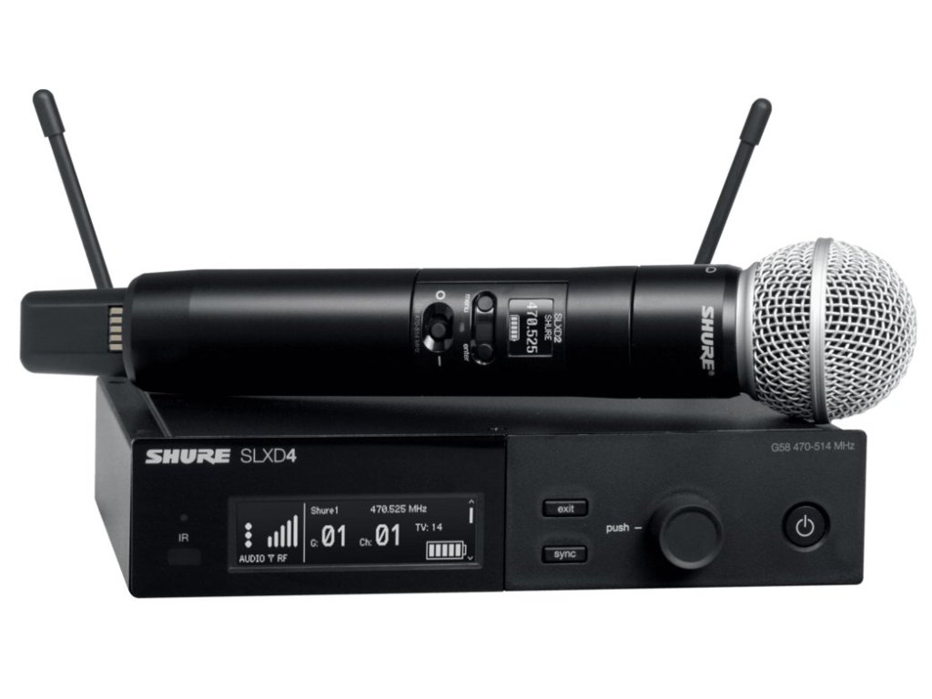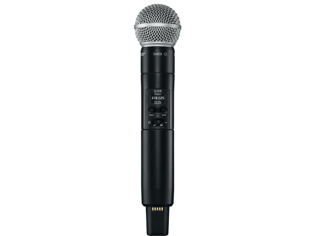 Do sterowania służy wyświetlacz LCD o wysokim kontraście i dwa przyciski nawigacyjne. Szybkie uruchomienie zestawu ułatwia automatyczne parowanie IR odbiornika z nadajnikiem. W zależności od wybranego trybu pracy można bez niepożądanych interferencji obsługiwać do 12 systemów jednocześnie. Nadajnik jest wyposażony w legendarną dynamiczną kapsułę mikrofonową SM58, która zapewnia czysty, niezakłócony dźwięk w całym spektrum od 50 Hz do 15 kHz. Jej charakterystyka częstotliwościowa jest dostosowana do nagrywania wokalu na żywo. Dzięki systemowi wymiennych kapsuł, w razie potrzeby SLXD2 można wyposażyć w inny typ głowicy mikrofonowej (sprzedawane jako oddzielne akcesorium). Nadajnik jest w stanie pracować do 8 godzin na jednym ładowaniu. Do zasilania można użyć dwóch baterii AA lub akumulatora Shure SB903.