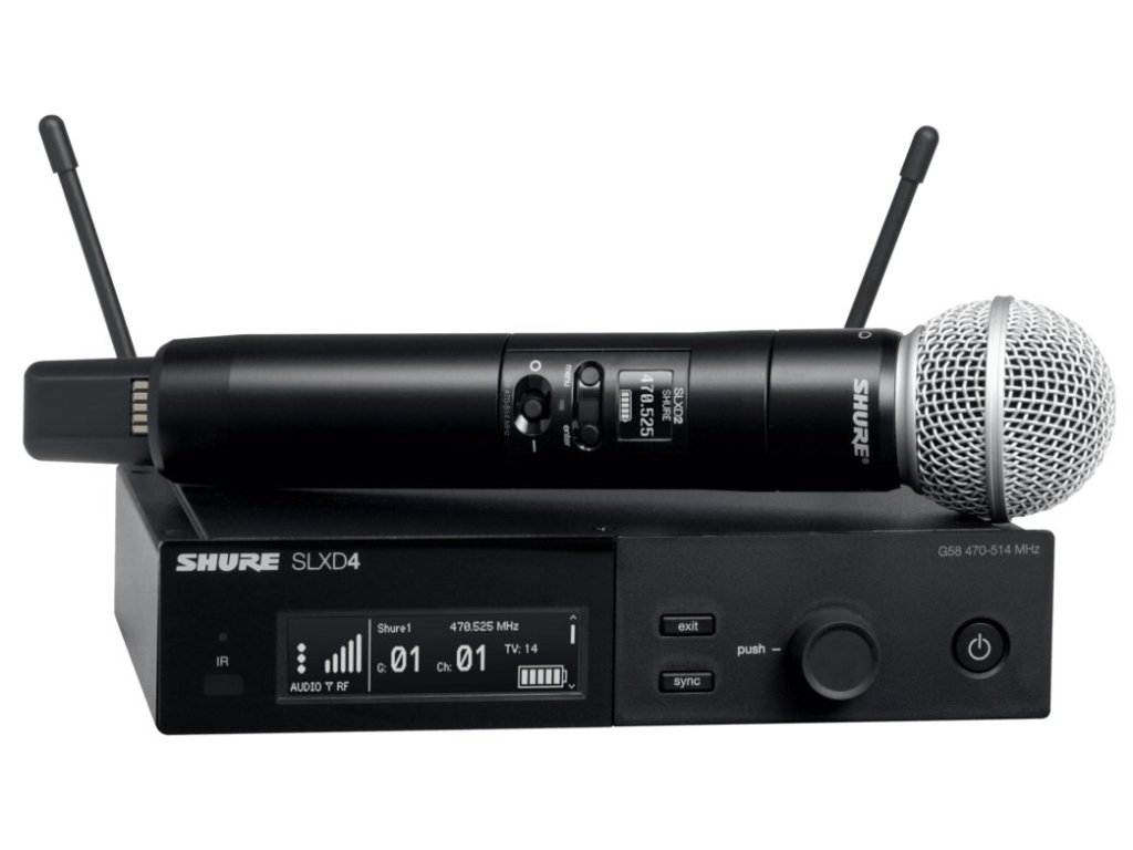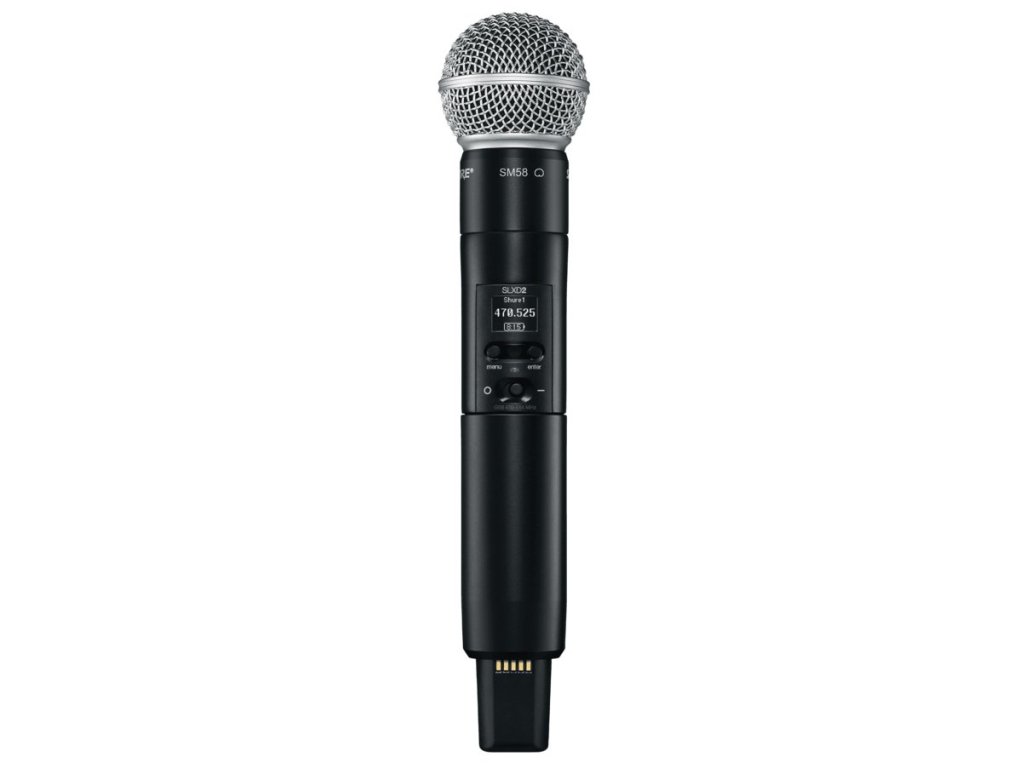 Do sterowania służy wyświetlacz LCD o wysokim kontraście i dwa przyciski nawigacyjne. Szybkie uruchomienie zestawu ułatwia automatyczne parowanie IR odbiornika z nadajnikiem. W zależności od wybranego trybu pracy można bez niepożądanych interferencji obsługiwać do 12 systemów jednocześnie. Nadajnik jest wyposażony w legendarną dynamiczną kapsułę mikrofonową SM58, która zapewnia czysty, niezakłócony dźwięk w całym spektrum od 50 Hz do 15 kHz. Jej charakterystyka częstotliwościowa jest dostosowana do nagrywania wokalu na żywo. Dzięki systemowi wymiennych kapsuł, w razie potrzeby SLXD2 można wyposażyć w inny typ głowicy mikrofonowej (sprzedawane jako oddzielne akcesorium). Nadajnik jest w stanie pracować do 8 godzin na jednym ładowaniu. Do zasilania można użyć dwóch baterii AA lub akumulatora Shure SB903.